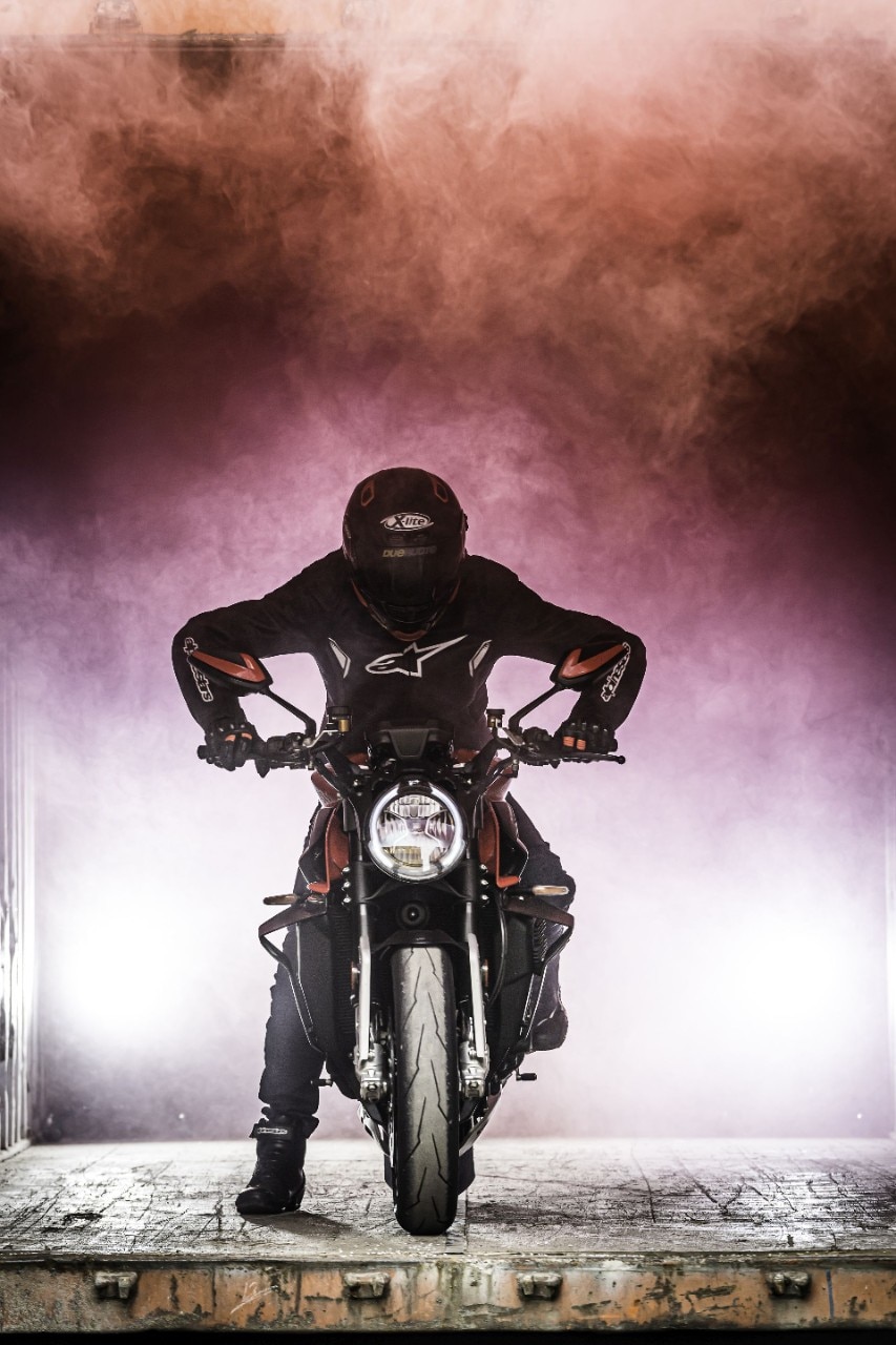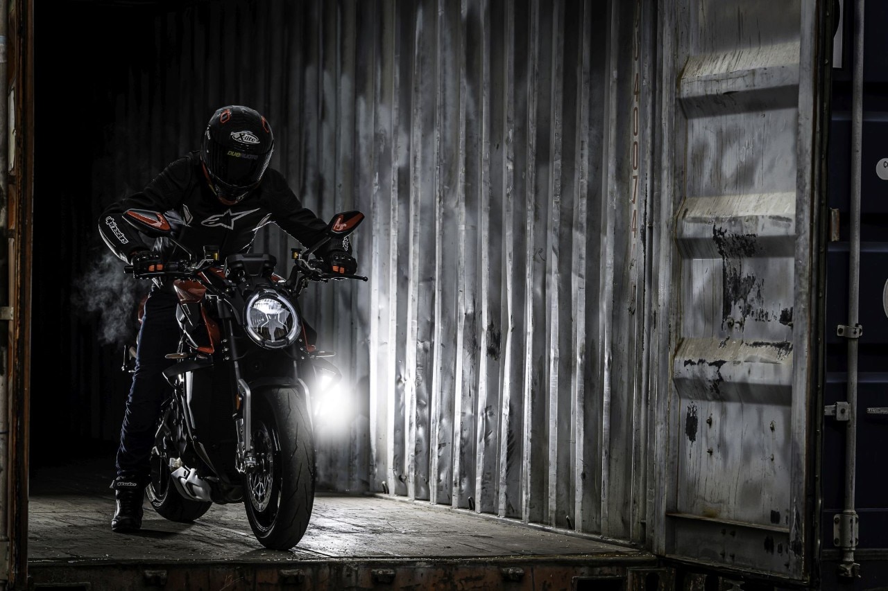 Rimanendo nella parte intermedia del contagiri l’asfalto sotto alle ruote corre sempre velocissimo e tenere il passo delle prestazioni della naked di Schiranna diventa un lavoro da piloti esperti, nonostante la completa elettronica che lavora nell’ombra ma che è davvero irrinunciabile vista la potenza in campo. Le tre mappe motore funzionano da riding mode, portando con sé setting preimpostati per i vari sistemi di ausilio alla guida. Noi ci siamo divertiti a crearne una quarta, la custom, in base ai nostri gusti utilizzando l’applicazione che permette di intervenire direttamente dal proprio smartphone su moltissimi parametri della moto.