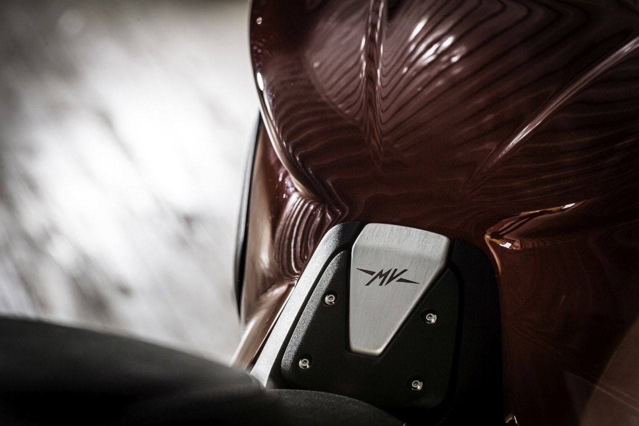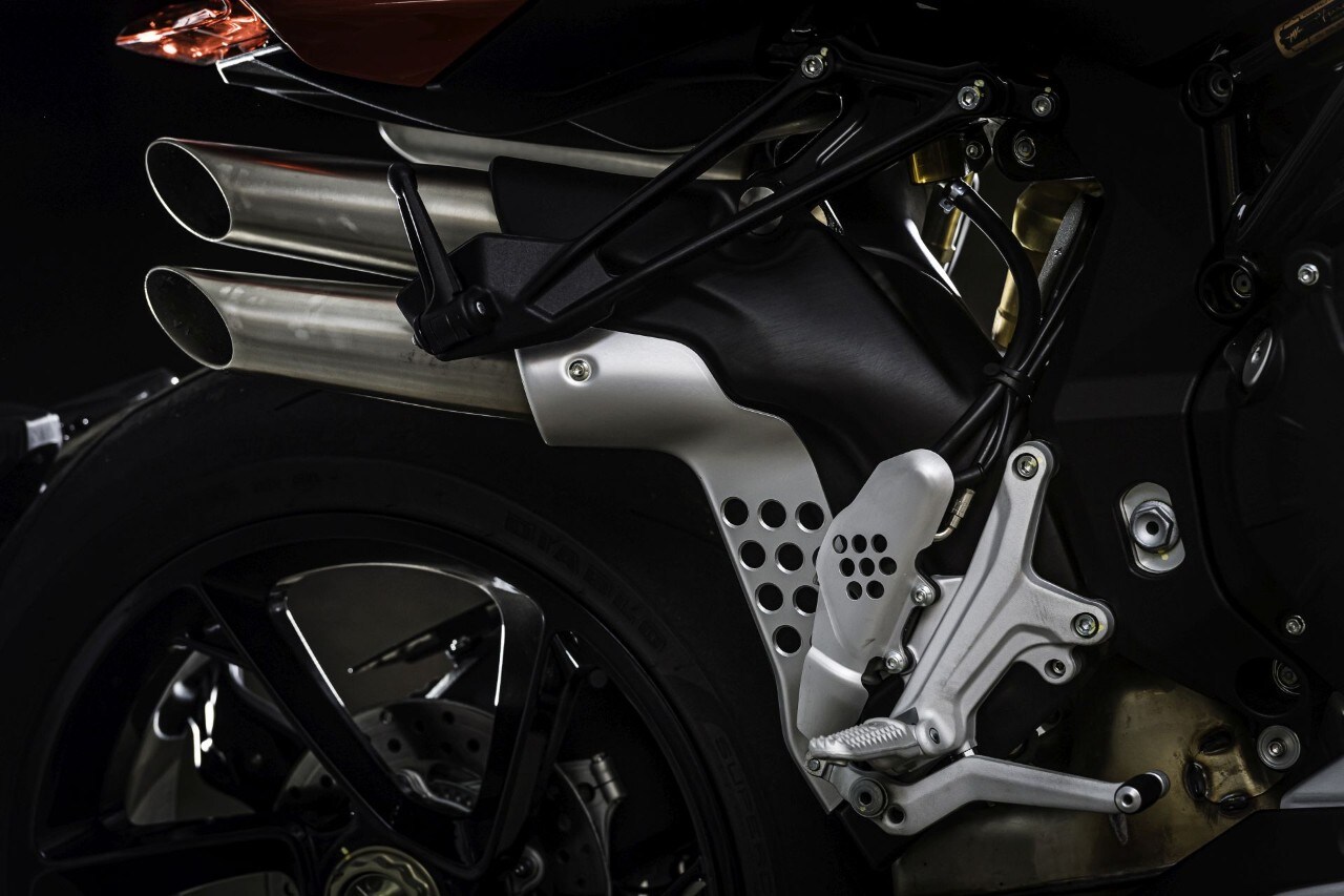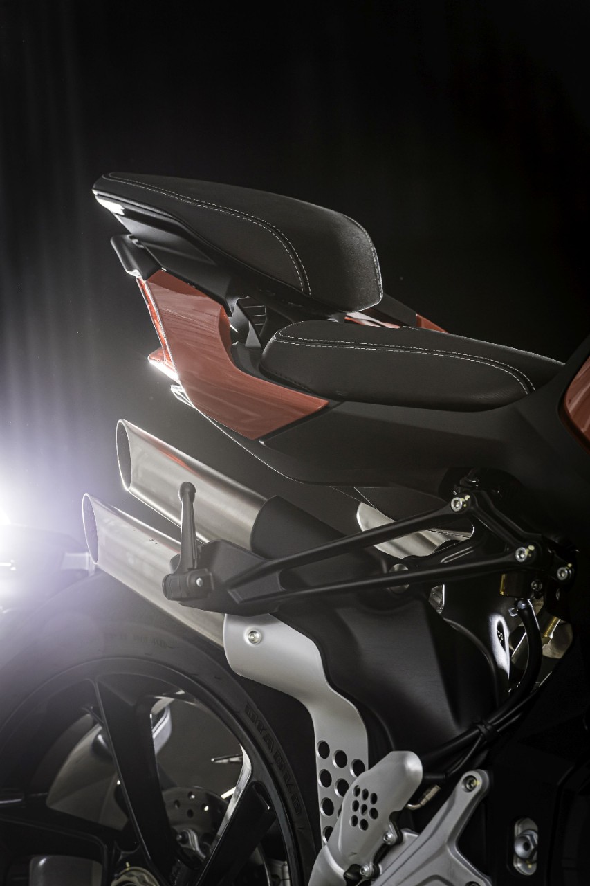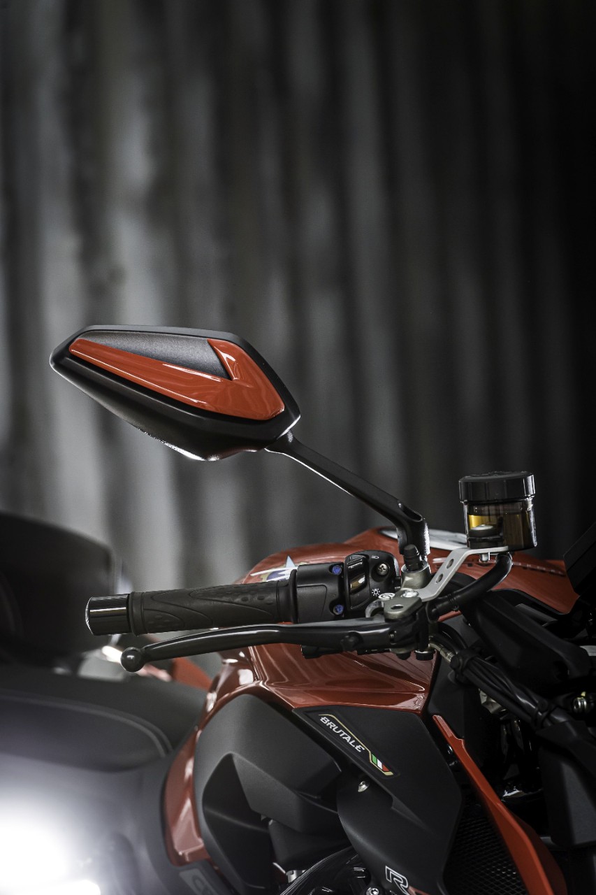 Poche sono le differenze rispetto alla RR, principalmente a livello di ciclistica con l’adozione di sospensioni a regolazione meccanica: forcella Marzocchi da 50 mm e ammortizzatore posteriore ZF, naturalmente pluriregolabili; resta invece l’ammortizzatore di sterzo elettronico Öhlins come sulla RR. Differenze che non incidono affatto sul fascino e l’appeal, che attirano un pubblico davvero trasversale incantato dal design della Brutale ferma sul cavalletto. L’incredibile cura dei particolari e le finiture sempre di alto livello la rendono quasi un oggetto di design, che di certo farebbe bella figura piazzato in qualche loft del centro.