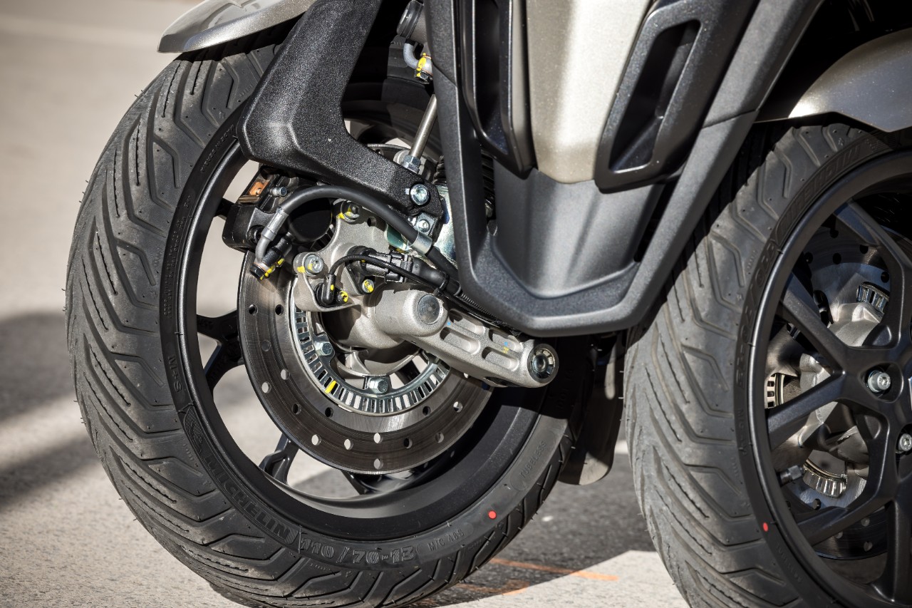 Il nuovo Piaggio MP3 è disponibile con due diverse motorizzazioni: il 400 da 35,3 CV è quello già utilizzato sul Beverly; arriva poi il nuovo monocilindrico 530 HPE da 44,2 CV. Nato sulla base del precedente 500, mantiene circa gli stessi numeri di potenza che però raggiunge ad un regime inferiore e ha una coppia massima superiore. Consuma leggermente meno – si parla di 25 km/l nel ciclo WMTC – ma i vantaggi più grandi arrivano dagli interventi attuati per migliorare il rendimento termodinamico, ridurre le vibrazioni e il peso. Sul 530 l’acceleratore è ride by wire e grazie ai riding mode la potenza è regolabile tramite tre mappe, con la Eco che riduce la potenza del 20%, la Sport che sfodera le piene prestazioni e la Comfort che non riduce le prestazioni ma offre un’erogazione più progressiva.