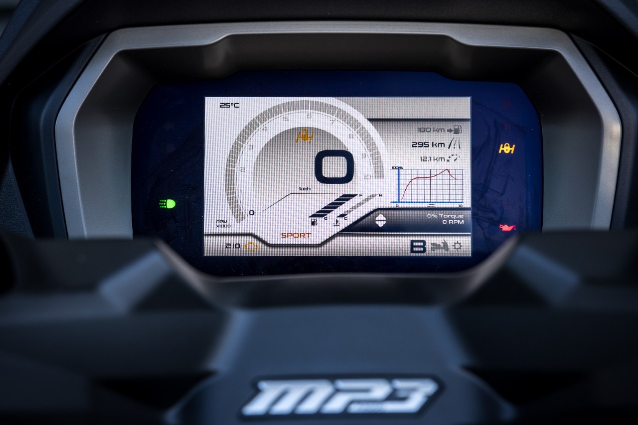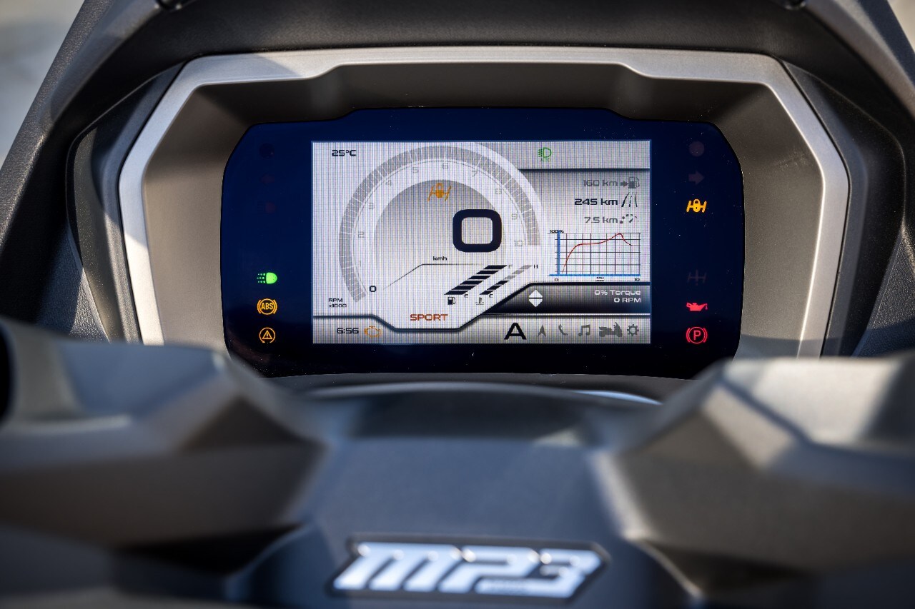 La rinnovata seduta è ben studiata con il manubrio alla giusta distanza e le pedane spaziose nonostante la presenza del pedale del freno. Il nuovo MP3 nel traffico è davvero piacevole; il comfort rimane elevato su tutti i fondi. Il lavoro fatto si sente, l’MP3 è ancora più intuitivo e maneggevole nel traffico e il feeling rimane unico anche in extraurbano; in curva entra facilmente, progressivo e svelto nei cambi di direzione, percorre le traiettorie senza scomporsi ed è bello scendere in piega con quella sensazione di sicurezza dovuta alla terza ruota. Efficace e prezioso il controllo di trazione, un punto in più anche in caso di pioggia.