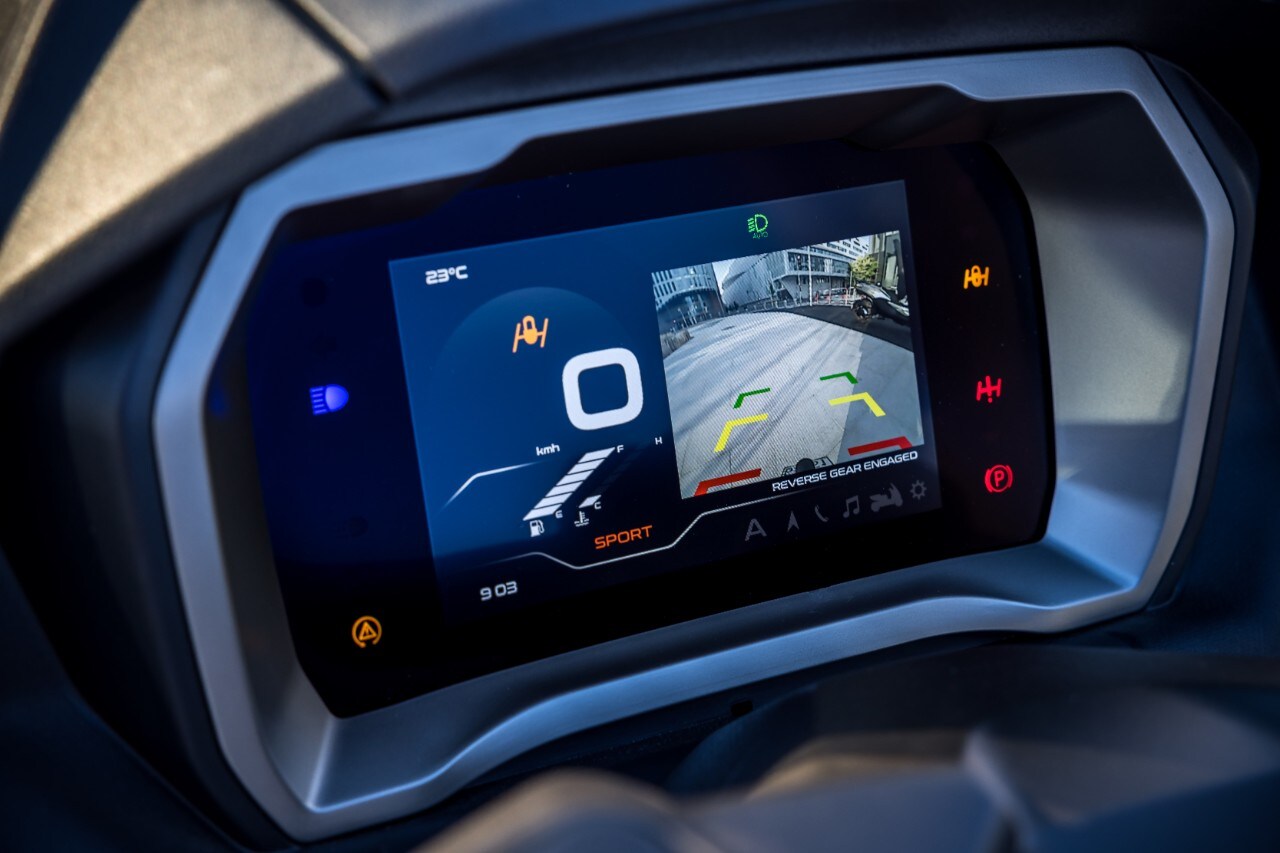 Da sottolineare come il nuovo MP3 530 Exclusive sia poi il primo scooter Piaggio a montare i sistemi ARAS derivati dal mondo auto, grazie a un nuovo radar installato al posteriore nato in collaborazione con Piaggio Fast Forward, in grado di monitorare la zona posteriore fino a 30/35 metri di distanza in ogni tipo di condizione. Due le funzioni: il BLIS (Blind Spot Information System) e l’LCDAS (Lane Change Decision Aid System) che consentono, tramite segnalazione sullo schermo TFT, di rilevare un veicolo nell’angolo cieco dello specchio retrovisore e segnalano l’arrivo imminente di un’auto o di una moto durante un cambio di corsia. Averli durante la guida fa la differenza, aumenta ancora di più la sicurezza di un mezzo che di sicurezza ne sa, anche se si apprezzerebbe la segnalazione tramite LED sullo specchietto piuttosto che sullo schermo. Sulla versione 530 HPE Exclusive c’è la retromarcia con telecamera posteriore che proietta l’immagine sul display, come sulle auto. Facile da usare, si aziona con il pulsante d’avviamento che attiva un motorino elettrico e le manovre risultano molto più semplici, soprattutto in caso di pendenza, visto che il peso del 530 è sì diminuito, ma resta comunque importante.
