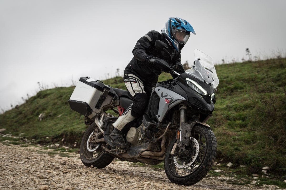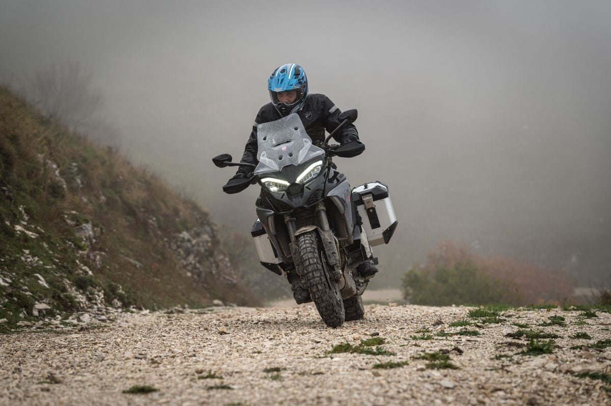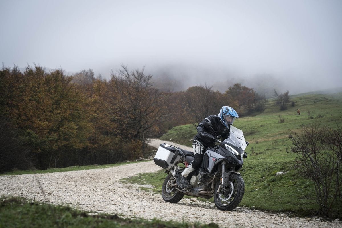 La Multi però mi ha divertito moltissimo e impegnato davvero poco. Riding mode Enduro selezionato e la V4 italiana sale senza apparente difficoltà, col motore che aiuta tanto grazie alla risposta perfetta fin da poco sopra il minimo. Le sospensioni funzionano alla grande, digerendo anche il sasso più rognoso senza scomporre la moto, e i passaggi che mi sembravano ostici passano sotto alle ruote della Multi senza alcuna difficoltà. Finito il percorso sterrato, prima di rimettere le ruote su asfalto, bastano pochi click con il joystick e la Multi torna una perfetta passista stradale.
