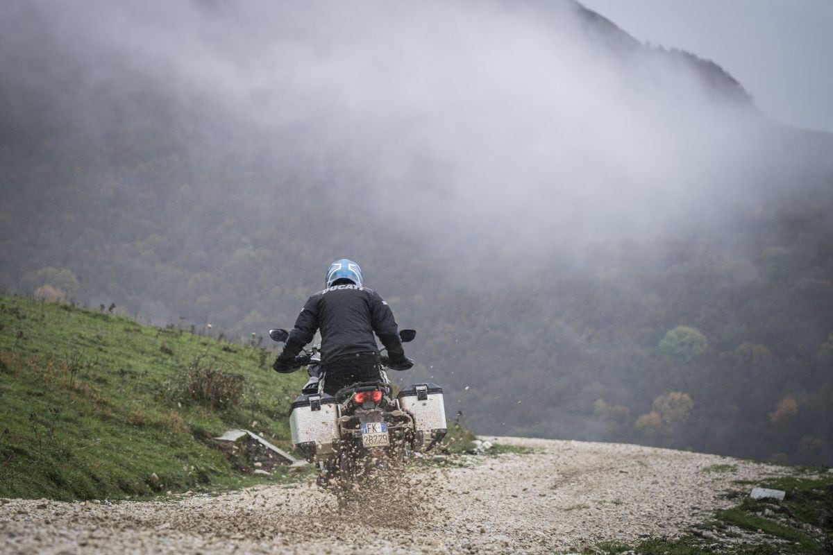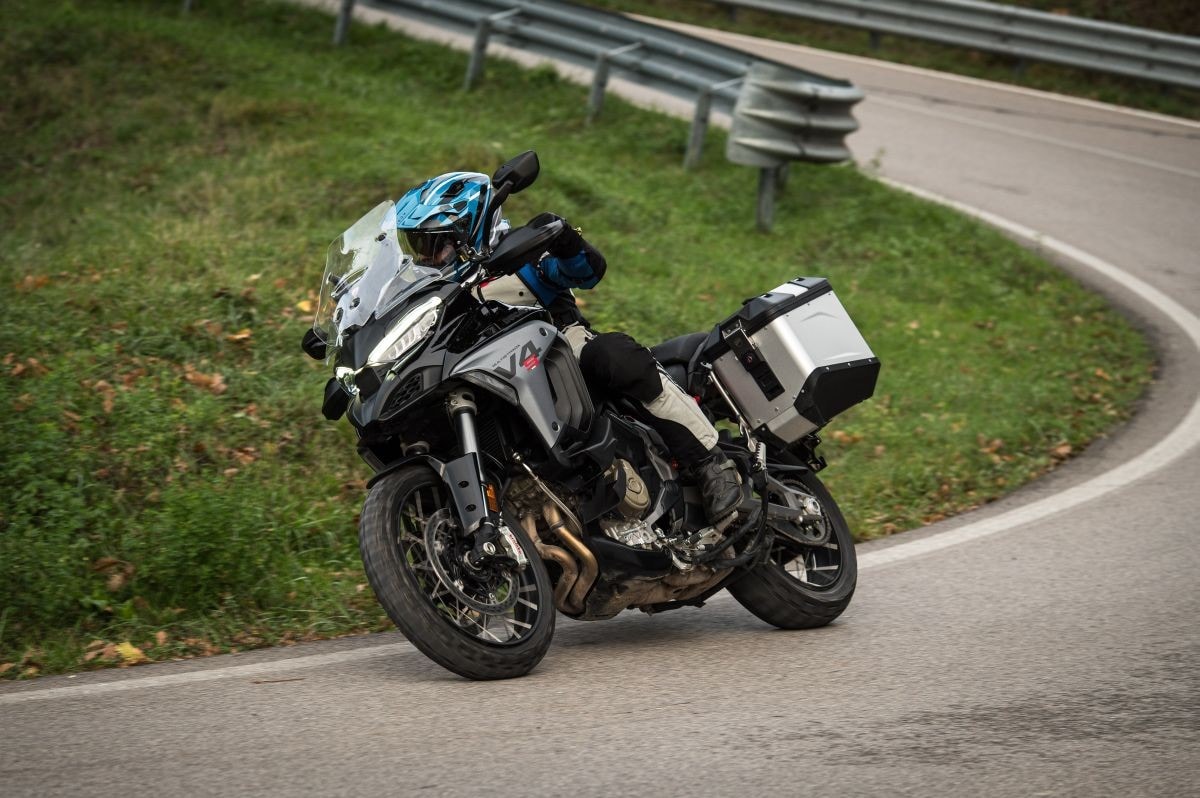 Passando alla versione dotata di cerchi a raggi e pneumatici Pirelli Scorpion Rally, con tanto di set di borse in alluminio e relativo telaietto dedicato, scopro una moto con una dinamica di guida sensibilmente diversa. L’aggravio di peso, nell’ordine di poco meno di 6 chili per cerchi e pneumatici, rende la Multi decisamente più controllata nello scendere in piega. Sembra più facile e confidente, pur regalando sempre un bel feeling con l’anteriore. Di contro perde qualcosa nella velocità nei cambi di direzione, ma parliamo di differenze piccole e poco significative. In questa configurazione mi trovo veramente a mio agio anche con condizioni difficili di grip, e in generale trovo la maxi bolognese più armonica ed equilibrata.