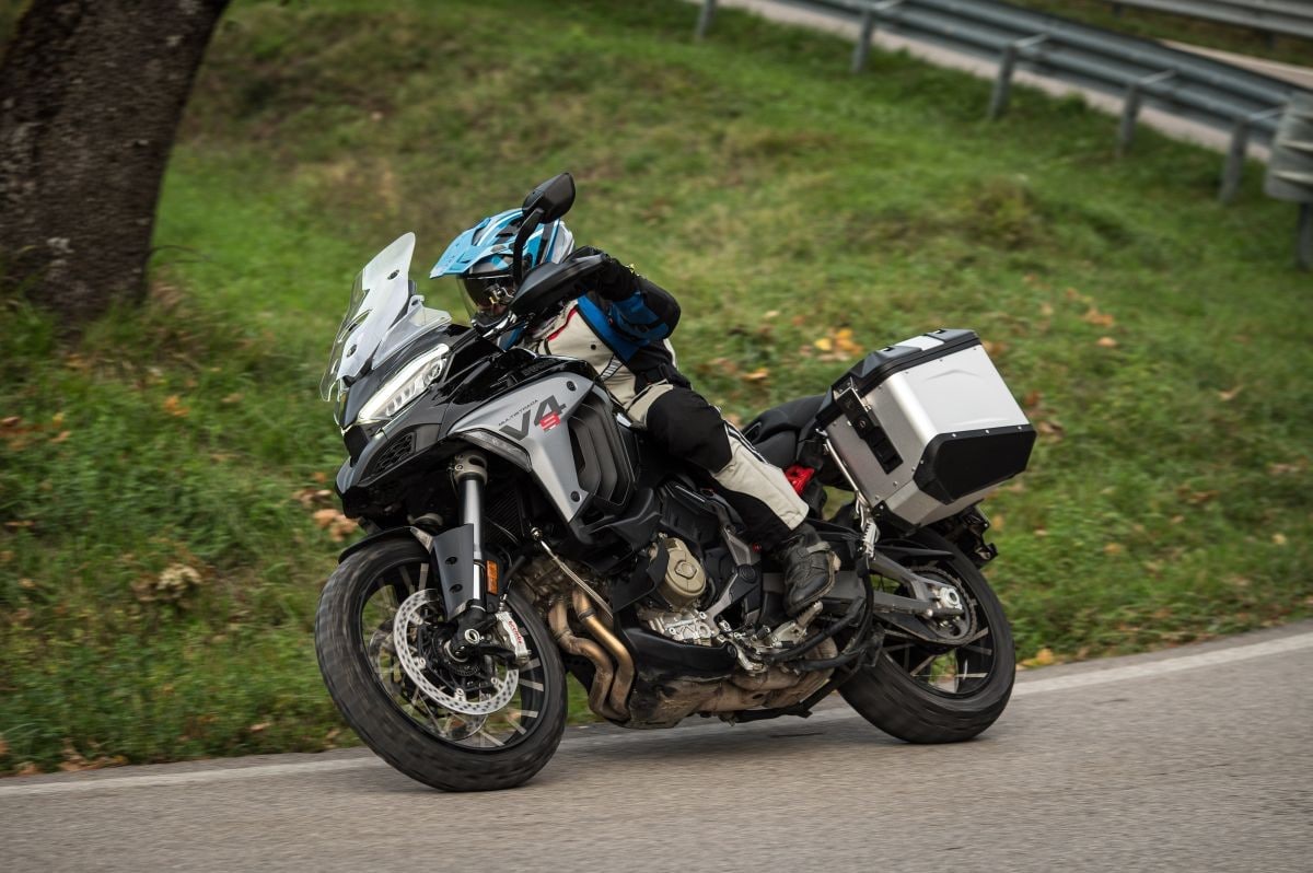 Il cuore pulsante rimane naturalmente il V4 Granturismo, con distribuzione a molle, l’albero controrotante e il sistema di disattivazione della bancata posteriore, non solo quando ci si arresta ma anche nelle condizioni di guida in cui velocità e regime di rotazione sono più bassi. La potenza è confermata in 170 cavalli a 10.750 giri (oggi raggiunta dalla KTM 1390 Super Adventure S con 173 CV) con una coppia massima di 12,6 kgm a 9.000 giri. Il propulsore bolognese trova spazio in un raffinato telaio monoscocca in alluminio, stesso materiale del forcellone bibraccio il cui perno è stato riposizionato un millimetro più in alto, per ridurre l’effetto anti-squat della sospensione nelle forti accelerazioni soprattutto a pieno carico e ottenere un comportamento dinamico più naturale e preciso.