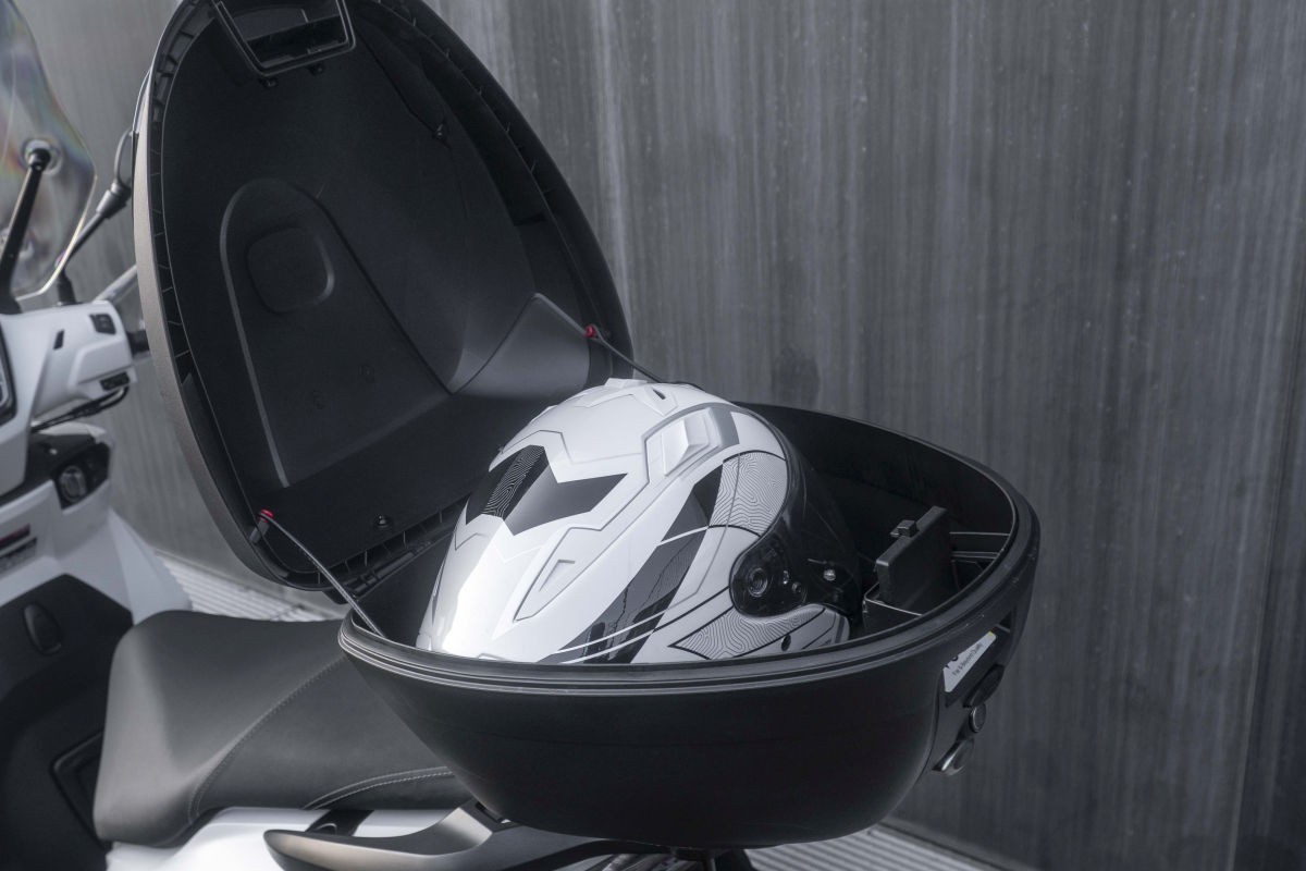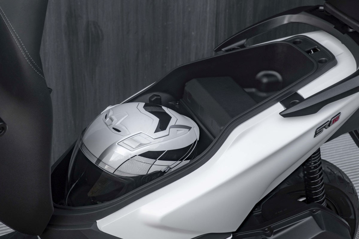 Un supporto, quest'ultimo, utile per chi ha bisogno di ulteriore capacità di carico: la pedana piatta rientra nella capienza media del segmento (anche se non lascia troppo spazio al centro, dove si inserisce la sella, e il gancio nel retroscudo è sottodimensionato), così come il sottosella, piccolo solo in apparenza ma talmente ben conformato da accogliere un casco jet di medie dimensioni e un paio di guanti da moto. Infine nel retroscudo, sulla sinistra, si trova un vano portaoggetti con una solida chiusura magnetica, con porte di ricarica Usb.