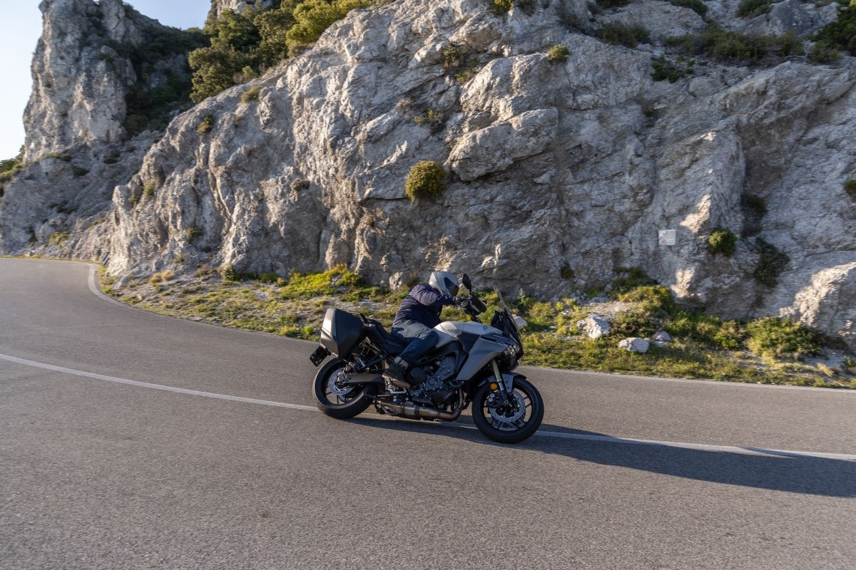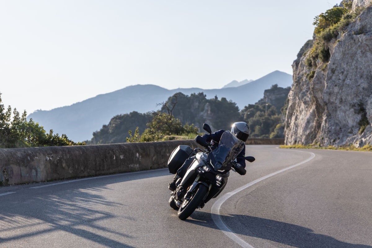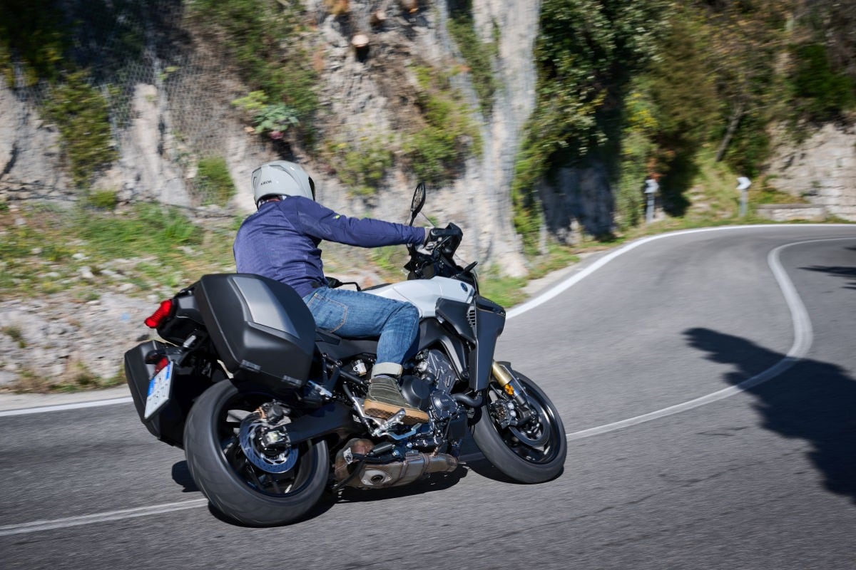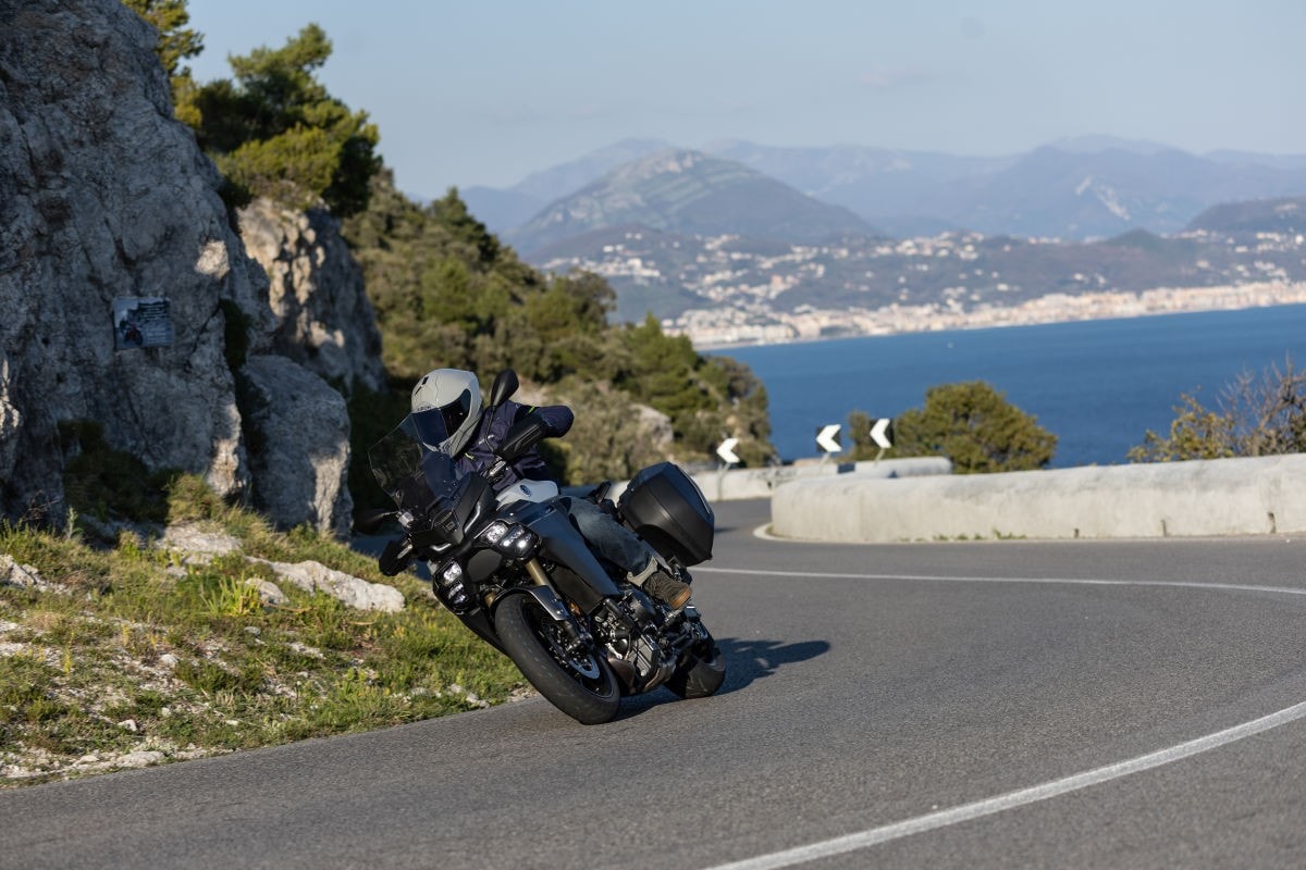 Il motore CP3 mantiene un’erogazione lineare, ma sopra i 5.000 giri la spinta si fa decisa, permettendo accelerazioni brillanti. Le vibrazioni sono minime ai bassi e medi regimi, ma diventano percepibili agli alti. La Tracer 9 GT+ offre un’ottima stabilità anche nei curvoni autostradali, mentre nel misto stretto si dimostra maneggevole grazie alla geometria del telaio Deltabox in alluminio.