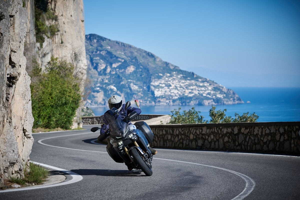 Salendo in sella, si percepisce subito il comfort migliorato. La posizione è rilassata, con le ginocchia meno piegate rispetto al passato, anche se la sella resta piuttosto rigida per una GT. La protezione aerodinamica è eccellente grazie alle numerose paratie e convogliatori, mentre le borse laterali illuminate offrono una buona capacità di carico senza risultare ingombranti.