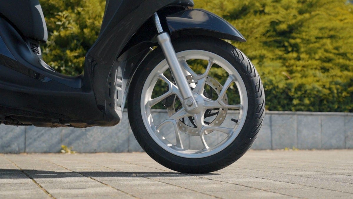 In effetti il Medley non ha dal punto di vista estetico un carattere molto marcato: è uno scooter ruota alta convenzionale, con pedana quasi piatta (di fatto lo è, al netto di un sottilissimo canale centrale che appena si percepisce) e schema ruote che vede un'anteriore da 16 pollici e una posteriore da 14.