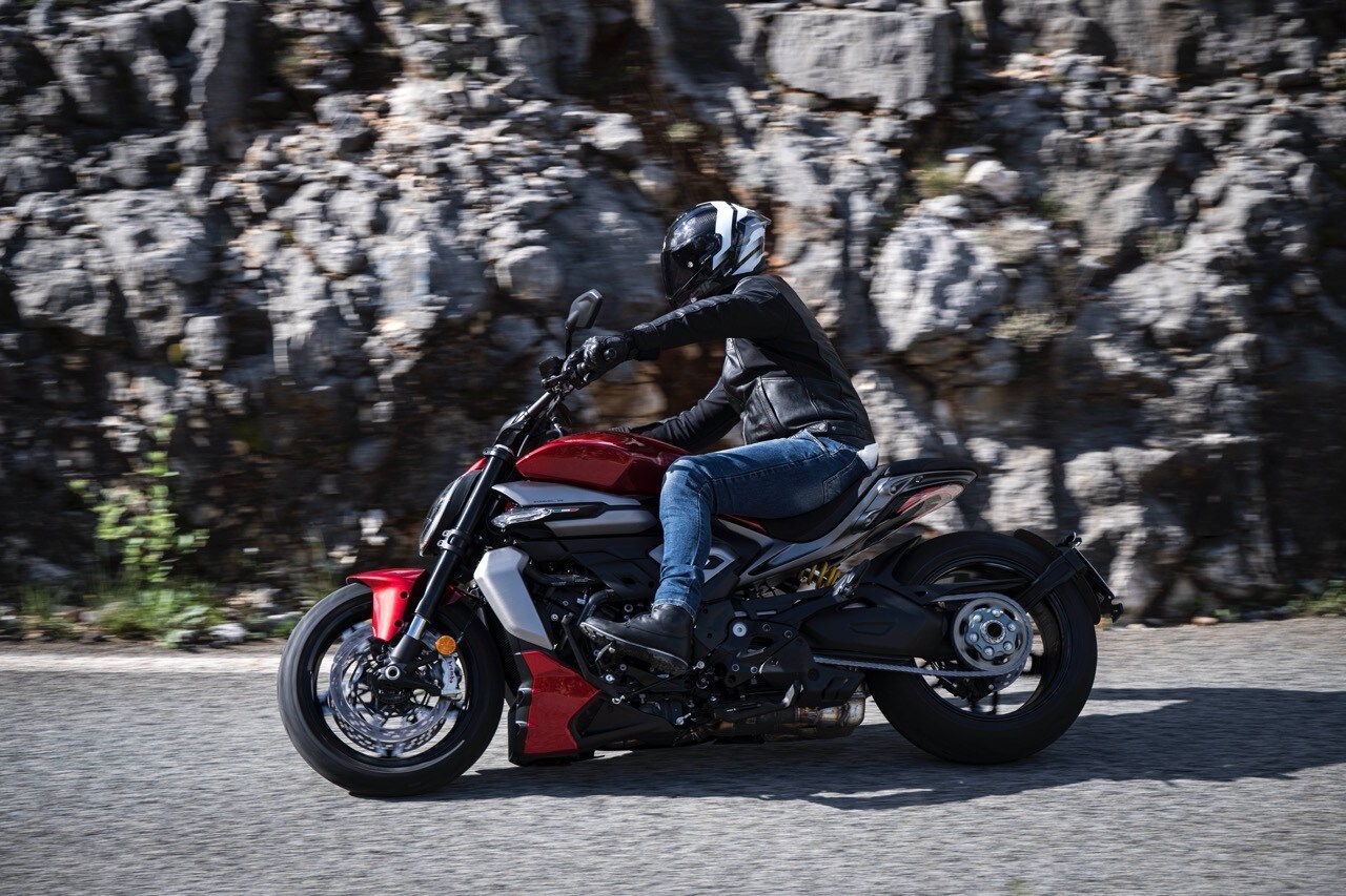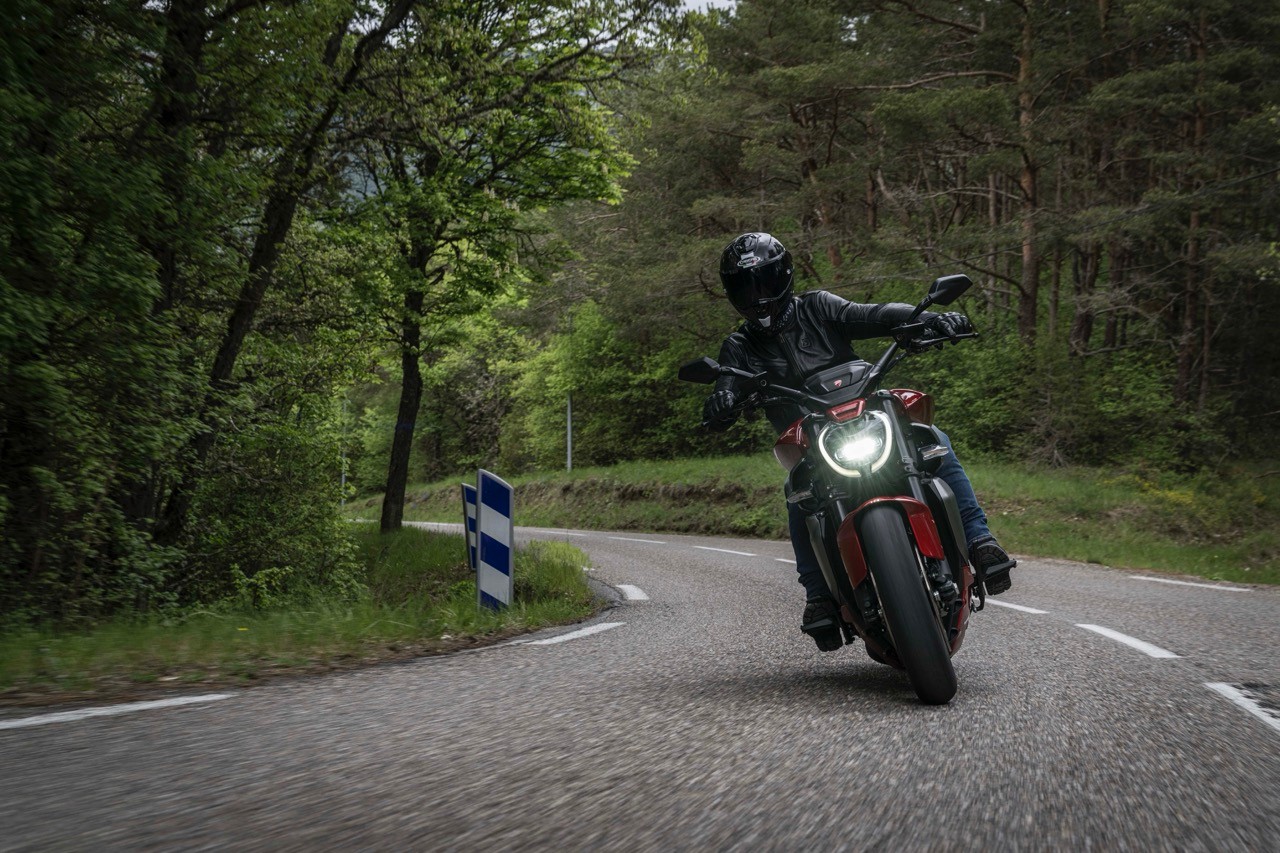 Il motore è l’unica non-novità di questa moto, lo abbiamo già provato sulla Diavel e sulle Multistrada V4, ma resta pur sempre grande protagonista. È il V4 Granturismo da 1.158 cc, 168 cavalli a 10.750 giri e 12,7 kgm a 7.500. Come sulle altre applicazioni, è caratterizzato da albero motore controrotante, per diminuire la massa volanica complessiva e quindi l’inerzia, e dal sistema di deattivazione della bancata posteriore. Questo, un espediente interessante per ridurre i consumi ma soprattutto il calore trasmesso al pilota, che entra in azione al minimo e in tutte le situazioni in cui sia richiesta poca potenza al motore, quando ci si va piano col gas insomma.