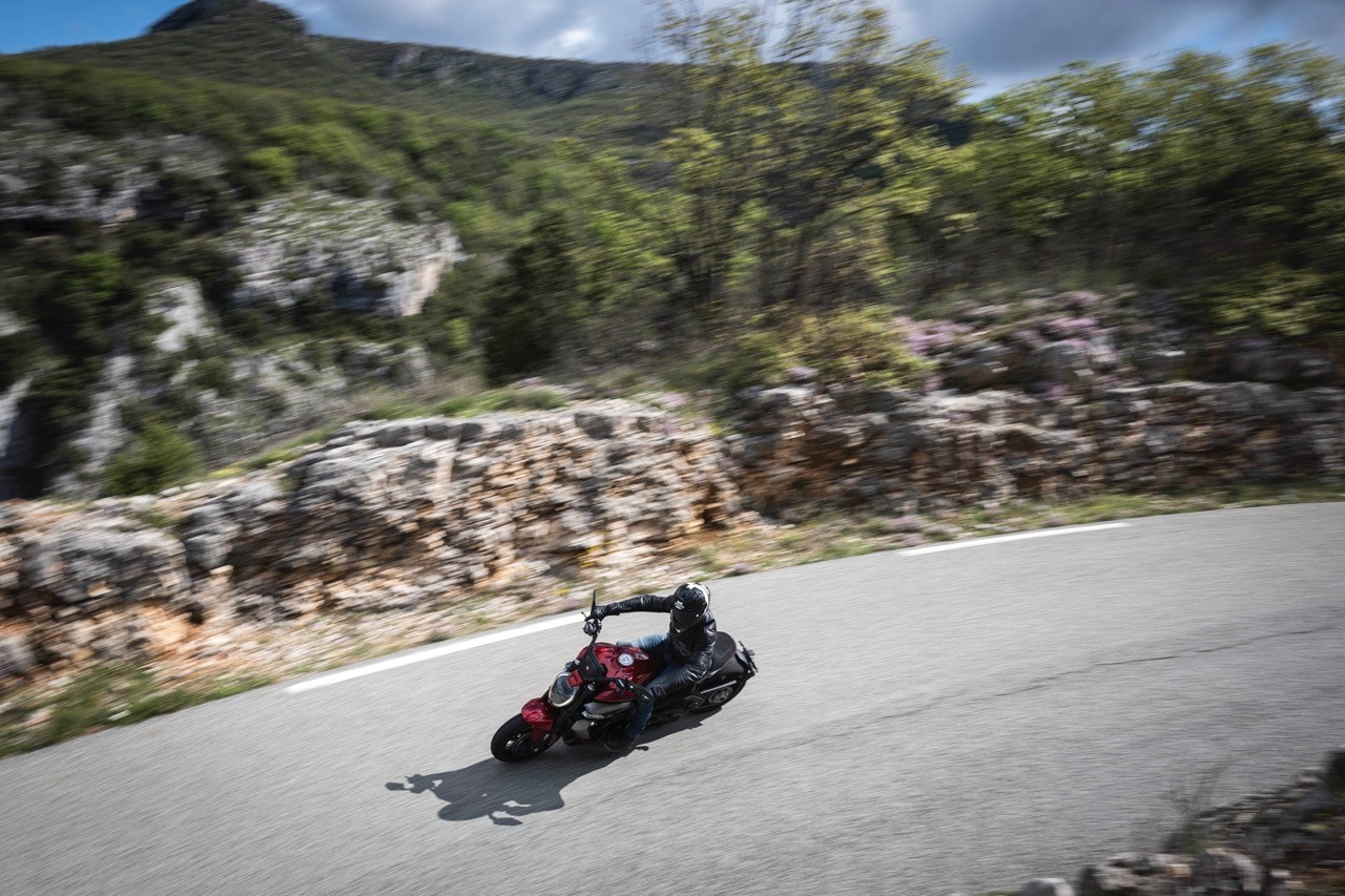 Si guida, eccome se si guida! I punti forti sono il baricentro basso, che le conferisce grande prontezza nei cambi di direzione, e un avantreno così solido che buttarla in piega ad alta velocità è veramente una goduria. Prese le misure, sai che ti puoi fidare, sai che lei terrà la linea con una precisione così millimetrica che pare di tenere il perno ruota anteriore tra i palmi delle mani. Disegna linee come un compasso, leggera ma tagliente, grazie anche al manubrio largo che offre la giusta leva per governarla.