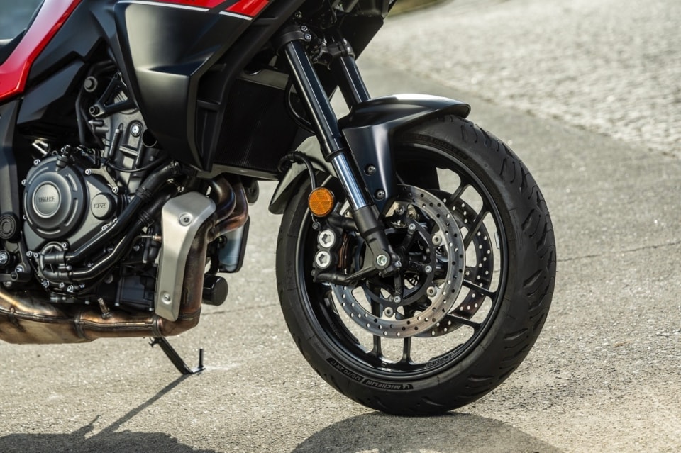 Con la nuova forcella arrivano nuovi piedini e, finalmente, di nuovo, due belle pinze freno anteriori a quattro pistoncini ad attacco radiale, che mordono dischi sempre da 298 mm. Sono ridisegnati i cerchi, naturalmente in lega da 17”, ora con un bel disegno a cinque razze sdoppiate. La Tracer 7 2025 guadagna 1 litro in più di capienza del serbatoio carburante, da 17 a 18, un nuovo manubrio, più largo, e il peso della versione standard è ora di 203 kg in ordine di marcia. Un qualcosa più del vecchio modello, ma ora è “più moto”.