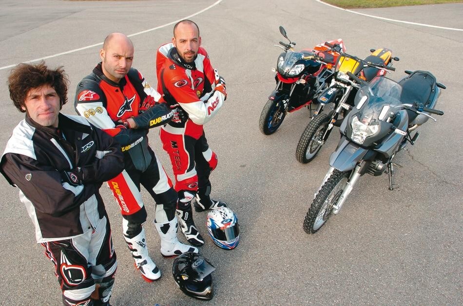 Il gioco è una delle componenti della nostra esistenza. In ognuno di noi, magari nascosto o assopito da anni di lavoro, c'è un bambino pronto a scatenarsi se le condizioni lo permettono. I nostri hobby in fondo non sono altro che un intermezzo ludico tra più o meno seriose faccende. La moto, in questo senso, come la bicicletta quando eravamo più piccini, è una sorta di sfida alle leggi della natura. E in molti casi più la sfida si fa impegnativa, più il gusto aumenta. Così, in maniera spensierata (ma nemmeno troppo...) anche noi di Dueruote ci siamo messi a giocare, inventandoci una sorta di triathlon. Poche le regole. Tre moto di estrazione completamente differente, ma tutte marcate Aprilia (un'enduro: la Pegaso 650 Trail; una supermotard: la MX 125, e una naked: la Tuono 1000 R). Tre percorsi che rispecchiano le caratteristiche dei mezzi impegnati: un insidioso fettucciato su terra, una tortuosa pista da supermotard e il tecnico handling di Vairano. E per finire tre aggressivi piloti specializzati in altrettante tipologie di guida e discipline. Il gioco consiste nel mettere alla prova i tre tester a rotazione su tutti i tracciati e su tutte le moto per verificarne pregi e limiti (il tutto spietatamente quantificato dal cronometro), le capacità di adattamento e gli eventuali errori di impostazione. La formula di gara prevede due giri di riscaldamento per ciascuno e tre tiratissimi giri cronometrati. Come era prevedibile il divertimento e le sorprese non sono mancate...