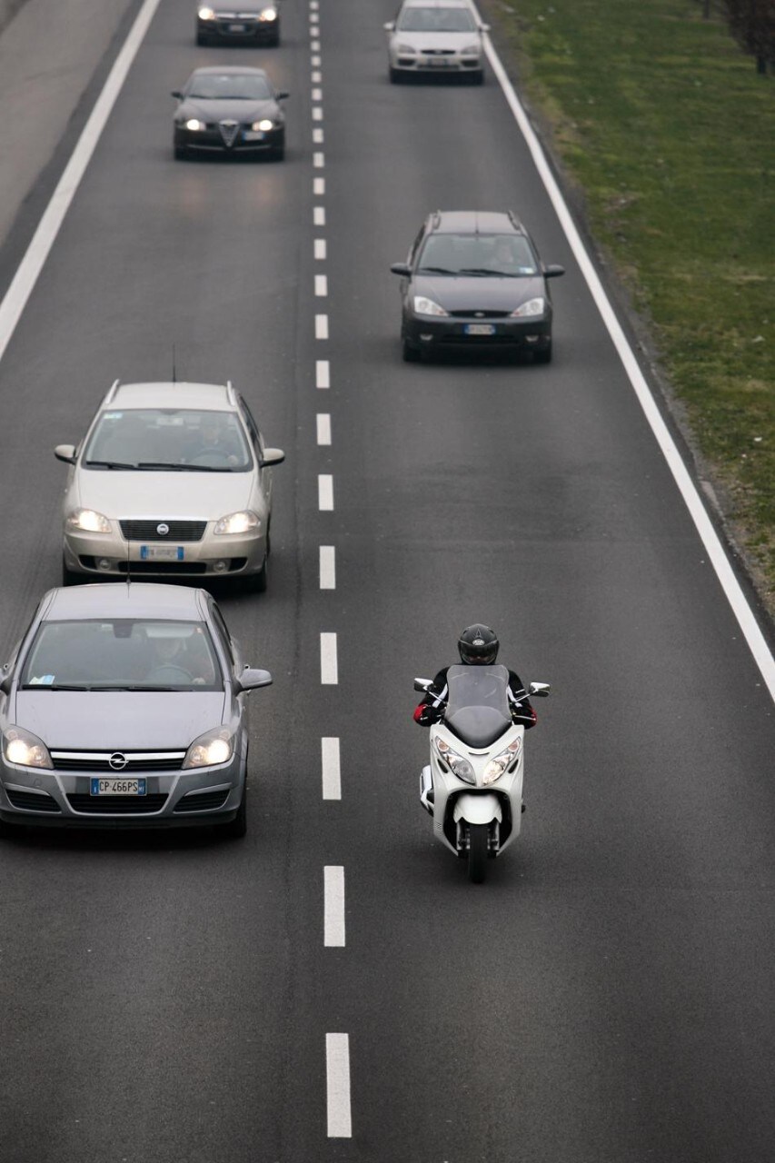 Sedendo a schiena dritta e gambe allungate ci si sente ben inseriti a bordo, protetti dallo scudo anteriore particolarmente ampio e dal grande parabrezza: i piloti alti più di uno e ottanta - è il mio caso - potrebbero lamentarsi per l'eccessiva vicinanza della sella al retroscudo, ma basterà armeggiare un po' col supporto lombare, regolabile su cinque posizioni, per ovviare almeno parzialmente al problema. Di solito, tornando a casa dall'ufficio, soprattutto quando è buio, passo attraverso il centro, perché, se posso, in scooter preferisco evitare la tangenziale: non mi sento abbastanza protetto. Una sensazione che col Burgman svanisce d'incanto. Sarà il quadro strumenti degno di una limousine forse lo scarso livello di vibrazioni, sarà la bolla aerodinamica che avvolge offrendo riparo dalle intemperie, sarà la potenza del gruppo ottico che assicura visibilità notturna (più probabilmente la somma di questi fattori), ma in sella al Burgman pare quasi di guidare un'automobile. Il maxiscooter Suzuki, animale urbano per antonomasia, già dal primo giorno di «convivenza» col sottoscritto si rivela un perfetto commuter per gli spostamenti su tangenziali, autostrade e tratti cittadini a scorrimento veloce. Tra i 90 e i 120 orari il mono giapponese ha ancora a disposizione una buona riserva di potenza e - anche se la ripresa non brilla facendo il confronto con certi concorrenti - i sorpassi dei veicoli lenti sono una pratica che si svolge rapidamente. Sui curvoni veloci la stabilità è da riferimento, merito della buona distribuzione dei pesi già citato baricentro basso ma anche del chilometrico interasse. I primi, sensibili ondeggiamenti si manifestano a velocità superiori a quelle consentite in autostrada e durante la sempre critica fase di sorpasso dei tir.