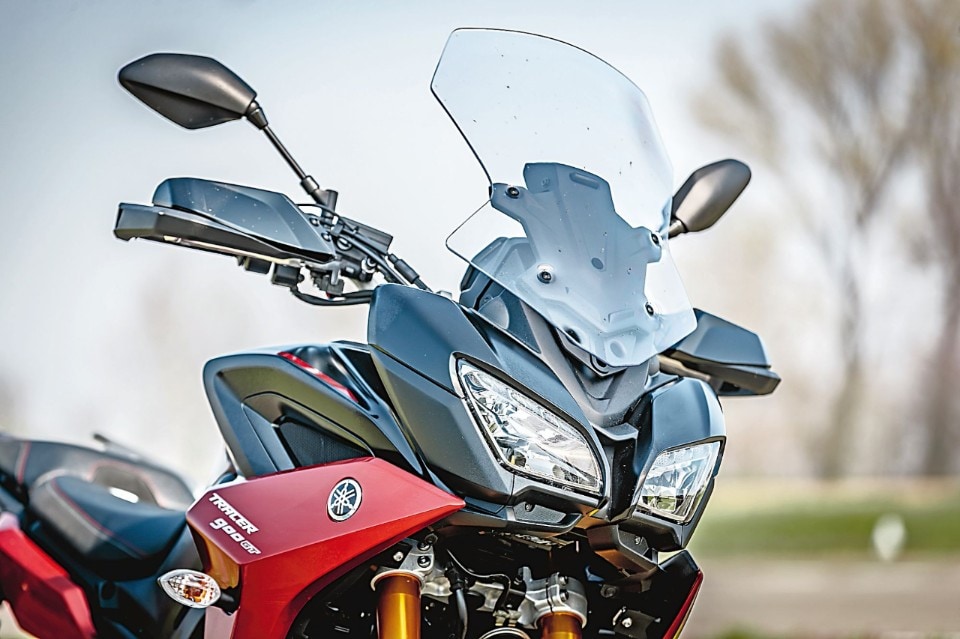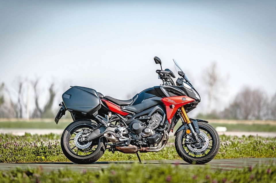 Racconto questa storia per rammentare quanto la BMW F 900 XR e la Yamaha Tracer 900 GT siano sorprendenti: per come interpretano il tema del turismo a tutto tondo e per come testimoniano della generale tendenza del mondo globale all’avvicinamento e all’ibridazione. Chi si sarebbe immaginato nel 2000 una Yamaha “così BMW” nel comfort e nelle dotazioni e una BMW “così Yamaha” nella dinamica di guida e nella linea? Nonostante questo, le due moto mantengono (fortunatamente) una personalità ben distinta. La Tracer 900 del 2015, attesissima dai tanti che attendevano una variante addomesticata della MT-09, motardona “dark side of the force”, era rimasta un po’ troppo reattiva nel motore e nel comportamento. Il suo moderno motore ride-by-wire da 853 cc e 115 CV a 10.000 giri/min, montato in una ciclistica corta e rigida con telaio doppio trave in alluminio e sospensioni tarate sul duro, scalpitava che era un piacere: fin troppo per una moto da turismo che risultava sì svelta, ma anche un po’ nervosa e un po’ “leggera” ad alta velocità (diciamo oltre i 180 km/h, non proprio medie da turismo all’italiana). Con il face lift del 2019, oltre a ricevere una carena più moderna, la Tracer è quindi stata resa più morbida e abitabile: forcellone allungato di ben 60 mm, telaietto posteriore modificato per ospitare meglio il passeggero, sospensioni ammorbidite e sella più confortevole. Che si aggiungono a una dotazione di base che ha tutto quel che serve per il turismo: serbatoio da 18 litri, parabrezza regolabile, controllo di trazione e ABS – sebbene non cornering – cavalletto centrale e una lunga lista di optional, fra cui diverse selle per variare la quota base posta a 850 mm da terra. Vocazione poi consacrata dall’arrivo della versione GT - la protagonista della nostra prova - dotata di serie di borse laterali da 22 litri l’una, quickshifter, manopole riscaldabili, strumentazione TFT e nuovi comandi elettrici, cruise control, forcella completamente regolabile e mono con precarico remoto.