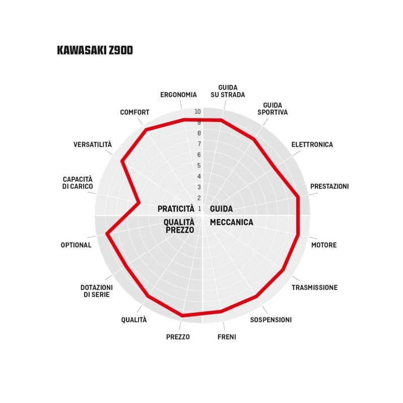 Anche nei cambi di direzione, nonostante sia la più pesante del lotto con i suoi 212 kg dichiarati contro i 210 della BMW e i 193 della Yamaha, la Z900 risponde lesta ai comandi senza alcuna sensazione di inerzia, e si lascia condurre tra le curve con scarso impegno da parte del pilota. Se però insistiamo con il gas e stimoliamo tutti i 125 CV disponibili, la Z sfodera un carattere aggressivo davvero esaltante. Il limitatore posto a 10.500 giri/min arriva in un baleno, accompagnato dall’urlo tipico dei quattro in linea. E quando si aziona la leva destra si trova una frenata all’altezza, nonostante l’assenza delle ormai irrinunciabili pinze ad attacco radiale. Va forte la Z900 al bisogno, come ama lasciarsi condurre senza fretta da brava ed efficace moto per tutti i giorni.
