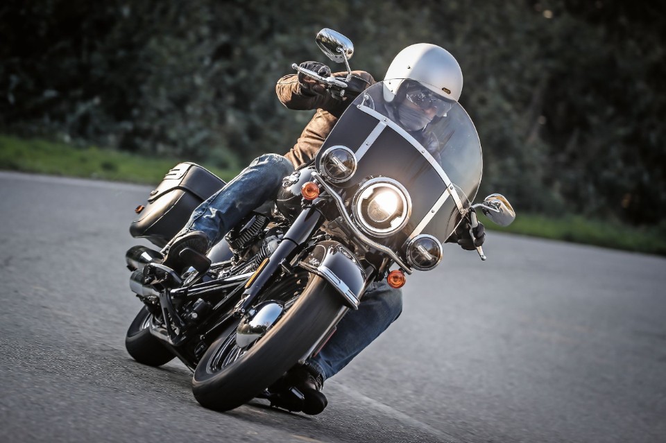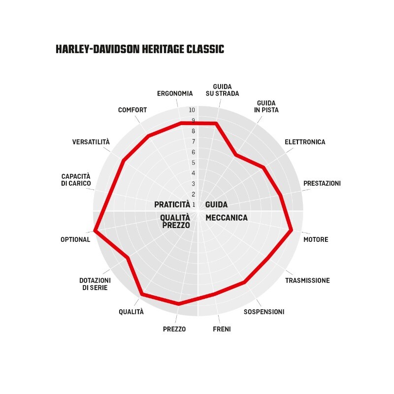 Il Milwaukee Eight è forse l’aspetto più sorprendente di questa moto. È talmente gentile e misurato nelle sue manifestazioni da sembrare quasi giapponese (che per Harley non è del tutto un complimento). Ha una tonalità di scarico fin troppo civile, vibra poco e praticamente solo al semaforo e ha una grandissima regolarità. Spinge subito, poi ha un’escursione limitata ma si muove su e giù con molta rapidità. Se si vuole procedere con sveltezza meglio usare il cambio, pur se come dicevamo la fretta non fa parte del vocabolario di queste moto. La Heritage Classic preferisce andar piano per farsi ammirare, e in questo fa alla grande il suo lavoro anche se in questa declinazione nero lucido non è più di tanto appariscente.