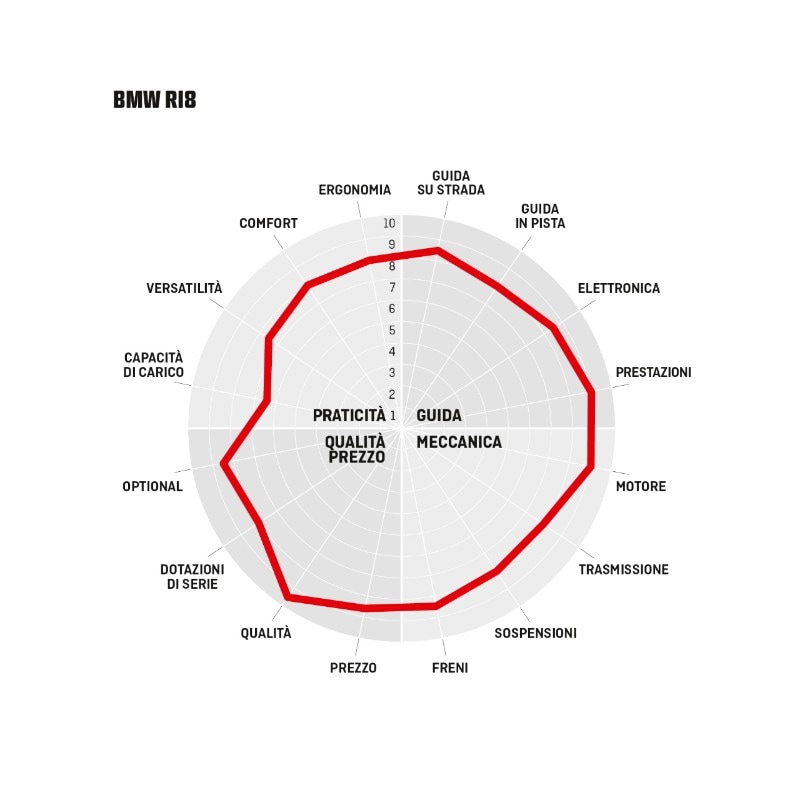 Dei boxer si è detto fino alla nausea che abbassano il baricentro e aiutano nella guida, ma lo sviluppo trasversale di questo 1.800 è così grande da impattare sulla maneggevolezza. Combinato con l’anteriore da 19” di larga sezione e il manubrio lontano, impone una grande attenzione in manovra; e a bassa velocità rimettere diritta la R 18 dopo una piega richiede un certo sforzo, nonostante il baricentro veramente rasoterra considerata la sella a 690 mm e la ridotta luce a terra, con le pedane che grattano piuttosto presto nelle rotonde. Detto comunque tutto questo, la R 18 verrà valutata soprattutto per la sua personalità, la sua presenza scenica e le sue finiture. E in ognuno di questi aspetti, sia chiaro, la tedescona spunta voti altissimi. Bene ha fatto BMW a non cedere alla tentazione di fare una cruiser all’americana: questa interpretazione mitteleuropea è sì più rischiosa, ma nel mondo cruiser è meglio essere difficili da digerire che identici a qualcos’altro. E anche se i puristi delle Harley difficilmente scenderanno dalla loro cavalcatura per salire su una BMW, non potranno non riconoscere che di fascino questa moto ne ha da vendere.