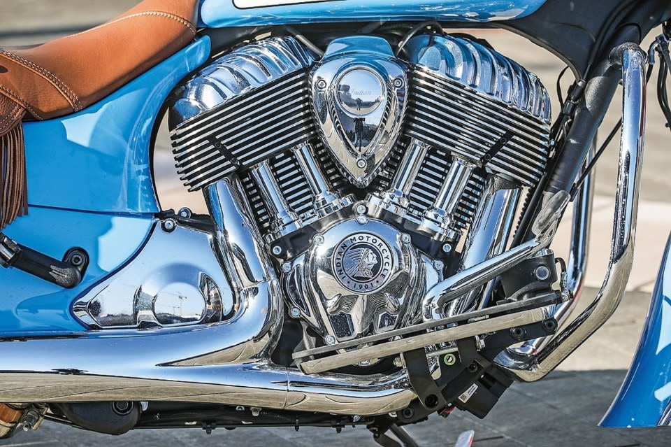 Emergono insomma i limiti di un’impostazione fin troppo soft, con la forcella che sulle buche pronunciate può andare a fine corsa anche in estensione; ma per il resto la Chief fa ottimamente il suo mestiere, che è quello di essere americana al 110%, ovvero in un certo senso ‘più Harley di Harley’. Vibra il giusto, ha un bel sound e dinamicamente è super-intuitiva una volta raggiunti i soliti 5 km/h in su: diremmo che tra le cruiser è difficile trovare qualcosa di meglio fino ai 110 km/h, quando il suo twin frulla placido a 2.500 giri/min facendoti avvertire distintamente le pulsazioni; ai 130 si sente già che è un po’ più su di quanto gradirebbe, ma col cruise control e quel po’ po’ di parabrezza la velocità autostradale la puoi tenere a tempo indefinito, grazie anche al maxi-serbatoio da quasi 21 litri. E quando la parcheggi, è difficile che non si formi un capannello di gente incuriosita.