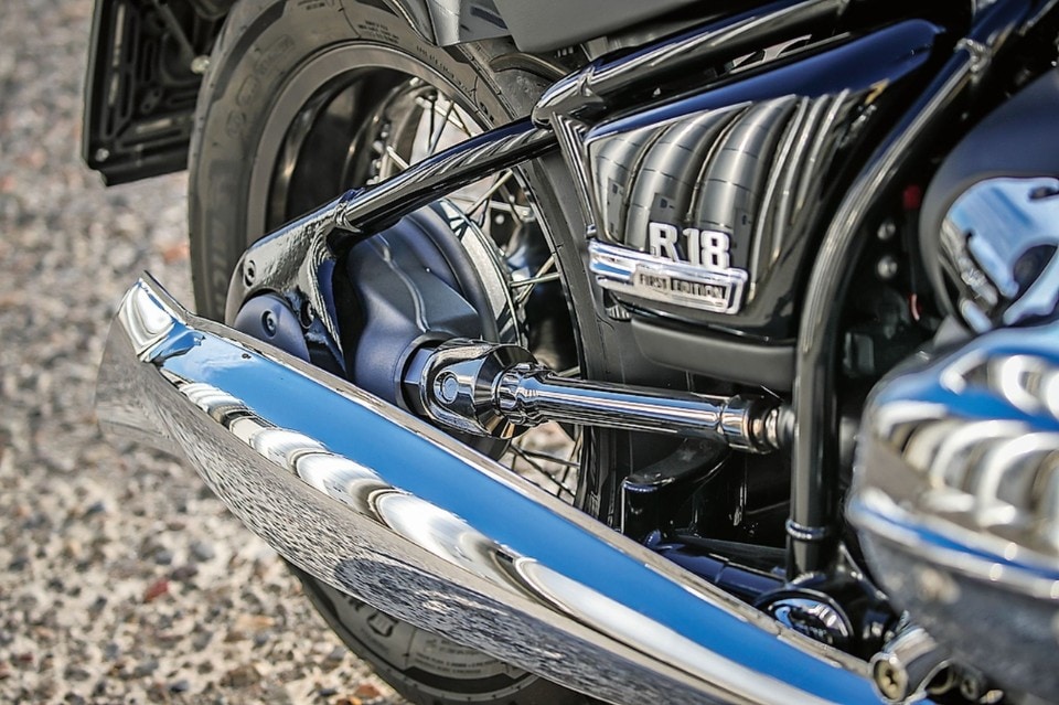 Bassa, lunga, costruita attorno al colossale blocco motore, la R 18 ricorda subito le BMW che abbiamo visto nei film di guerra, con il manubrio largo e rivolto all’indietro. I cilindroni (in particolare il destro, più arretrato a causa dello sfalsamento delle manovelle) impediscono di distendere le gambe, per cui l’impostazione delle braccia è classicamente da cruiser, mentre le gambe sono più da roadster e questa combinazione è unica. Non è scomoda e anzi ha i suoi vantaggi quando si vuole guidare davvero; ma unita alla sella piuttosto dura, rende l’esperienza sulla R 18 diversa dal solito.
