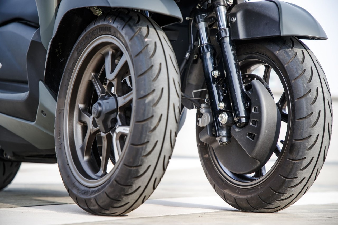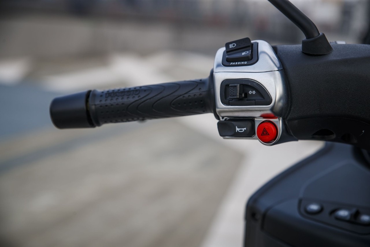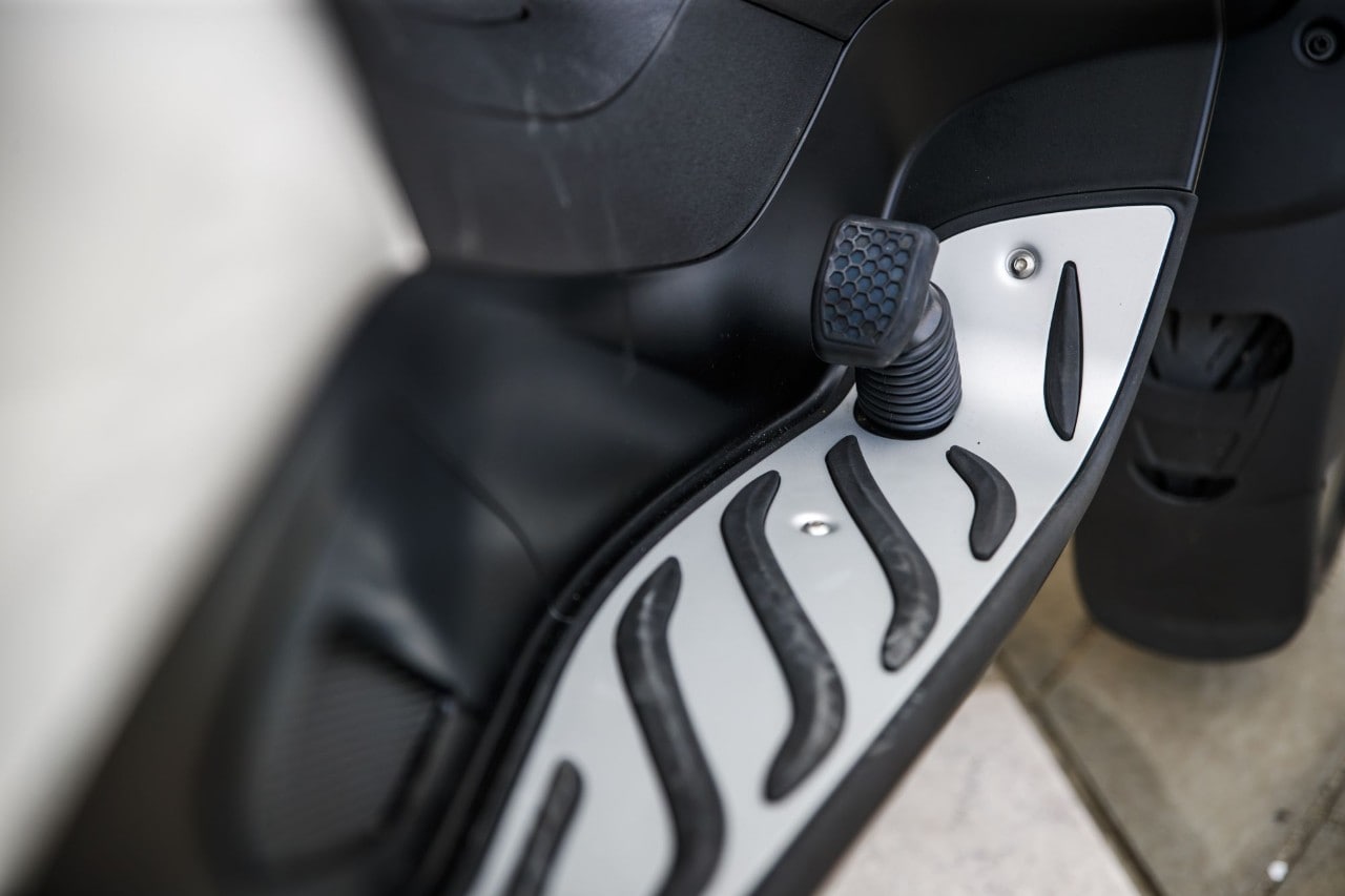 Il blocco elettrico del sistema di basculamento (non presente sui Tricity più piccoli) è una comodità: non tanto al semaforo, ma quando è il momento di parcheggiarlo perché facendo restare lo scooter in equilibrio permette di spostarlo a spinta senza fatica. Nelle soste brevi poi è comodo il cavalletto laterale, che i Piaggio MP3 non hanno.