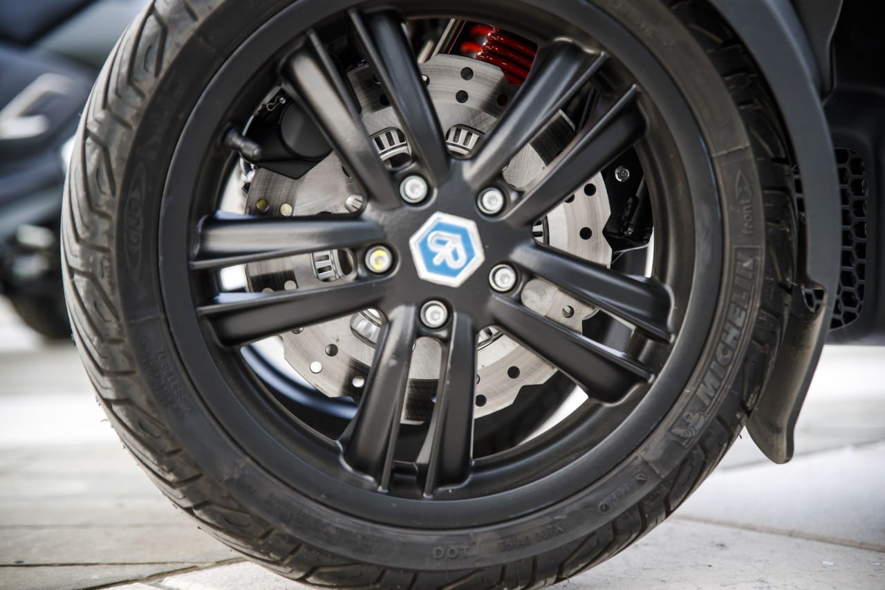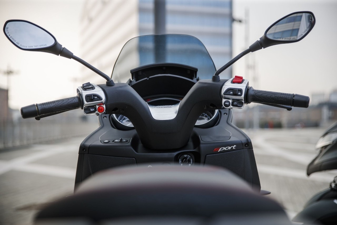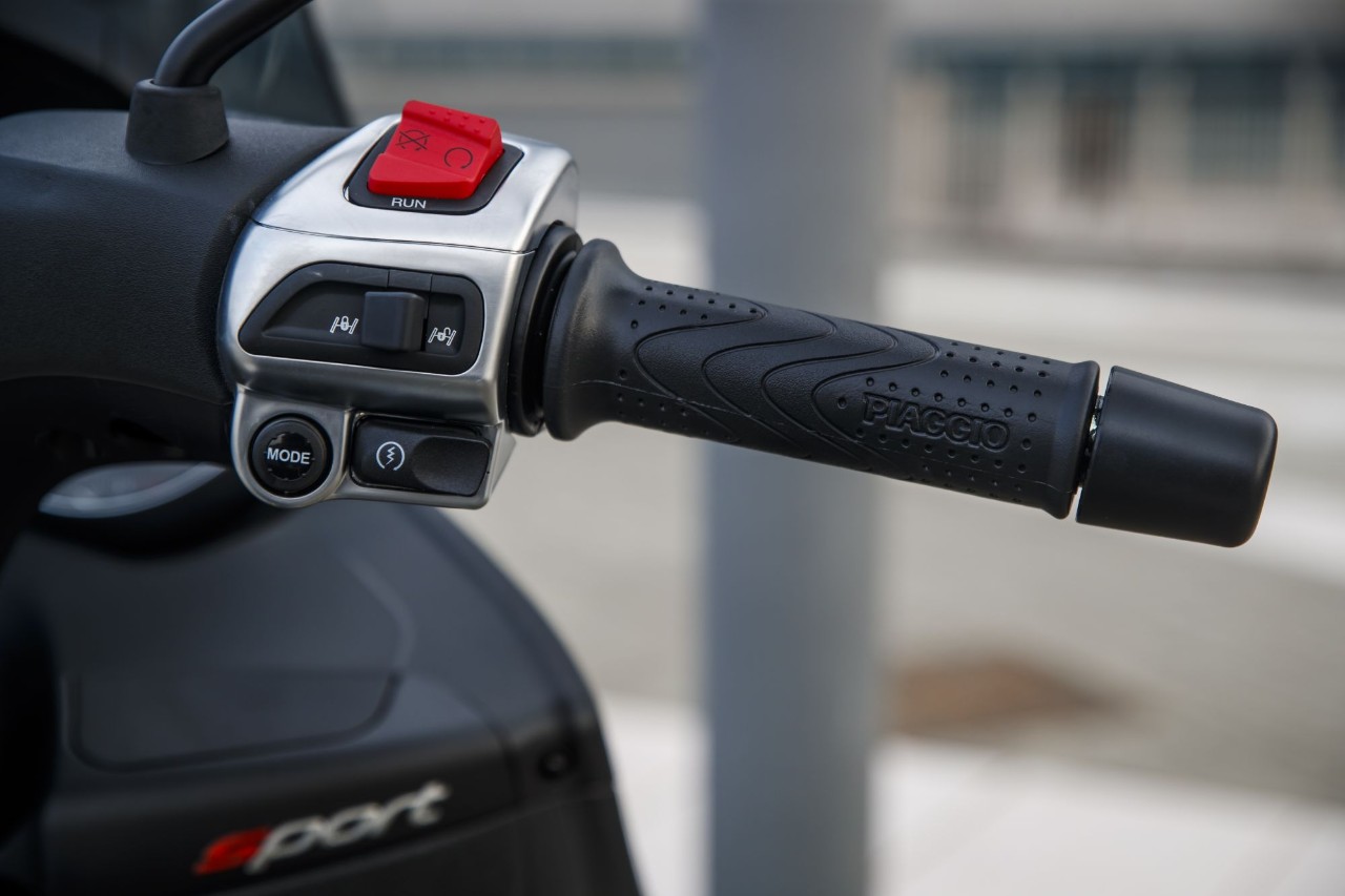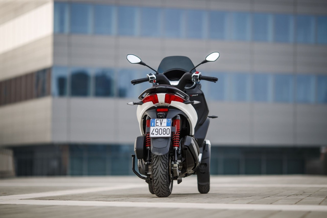 La qualità costruttiva è più che buona. Nel sottosella ci stanno due caschi. Niente vani nel retroscudo, c’è però un piccolo cassettino con presa USB sopra la strumentazione. Questa è chiara e si legge bene, ma ormai è un po’ datata nel design. In questa versione Sport, l’MP3 si distingue per i dettagli sportivi: finiture nere opache, ammortizzatori verniciati di rosso, pedana con inserti in alluminio, e freni a disco con profilo a margherita. Di serie il sistema multimediale Piaggio MIA, che abbinato alla App permette di connettere lo scooter allo smartphone.