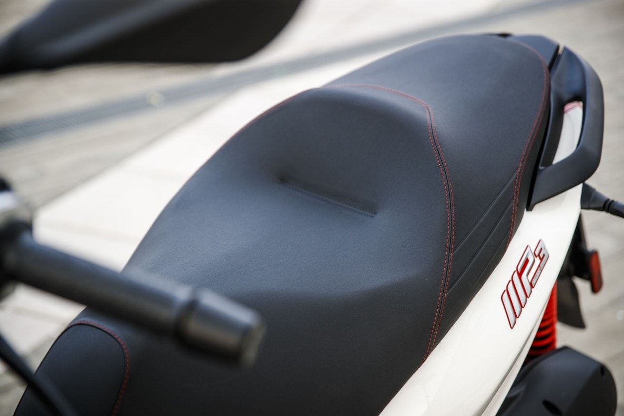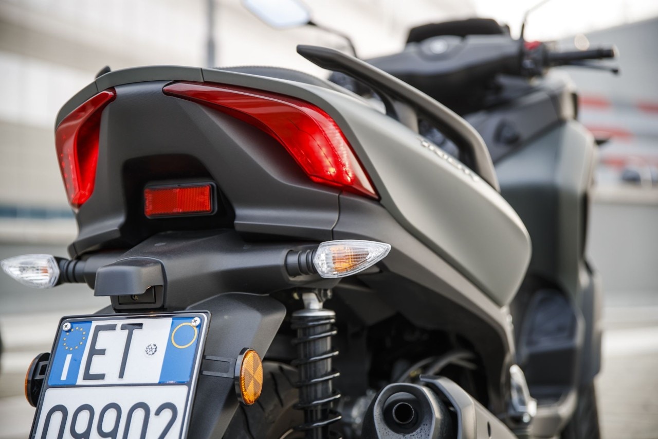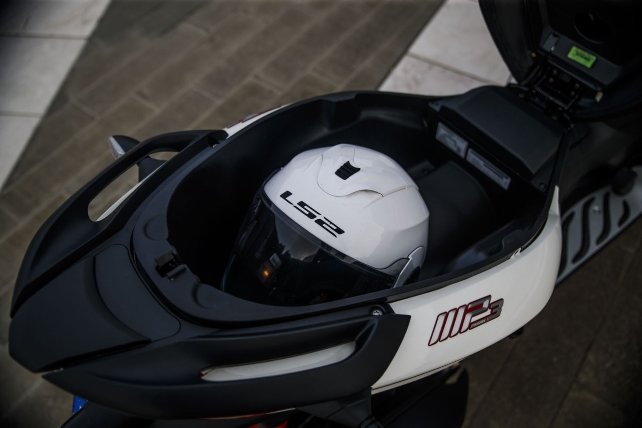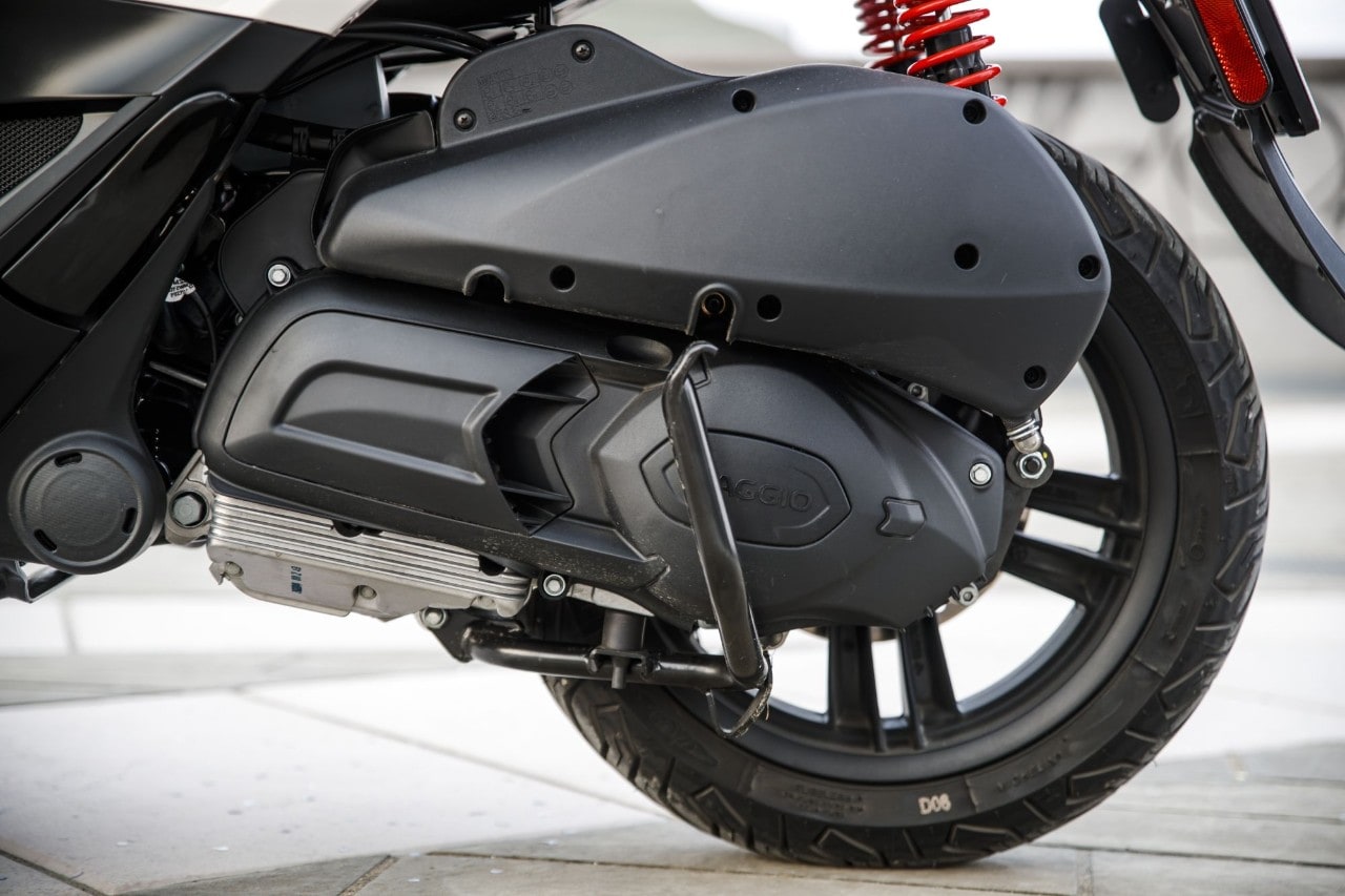La qualità costruttiva è più che buona. Nel sottosella ci stanno due caschi. Niente vani nel retroscudo, c’è però un piccolo cassettino con presa USB sopra la strumentazione. Questa è chiara e si legge bene, ma ormai è un po’ datata nel design. In questa versione Sport, l’MP3 si distingue per i dettagli sportivi: finiture nere opache, ammortizzatori verniciati di rosso, pedana con inserti in alluminio, e freni a disco con profilo a margherita. Di serie il sistema multimediale Piaggio MIA, che abbinato alla App permette di connettere lo scooter allo smartphone.