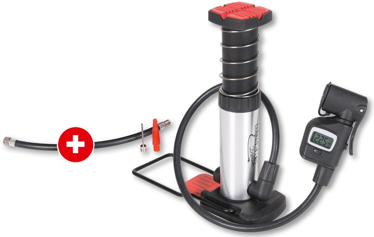 La minipompa Bikers Dream è uno strumento versatile, adatto sia alle moto che alle biciclette, nonché a una serie di oggetti da gonfiare come palloni o materassini grazie a degli adattatori forniti di serie. Funziona con un comando a “pedale”, è alta circa 17 cm, pesa 500 grammi ed in grado di gonfiare fino a 12 bar. Il manometro digitale, integrato nella testa, indica la pressione raggiunta e una staffa ribaltabile permette di tenerla salda con l’altro piede mentre la azioniamo. Sotto la base trovano posto gli adattatori e sono comprese una prolunga da 21 cm e la custodia. Costa 39,99 euro.