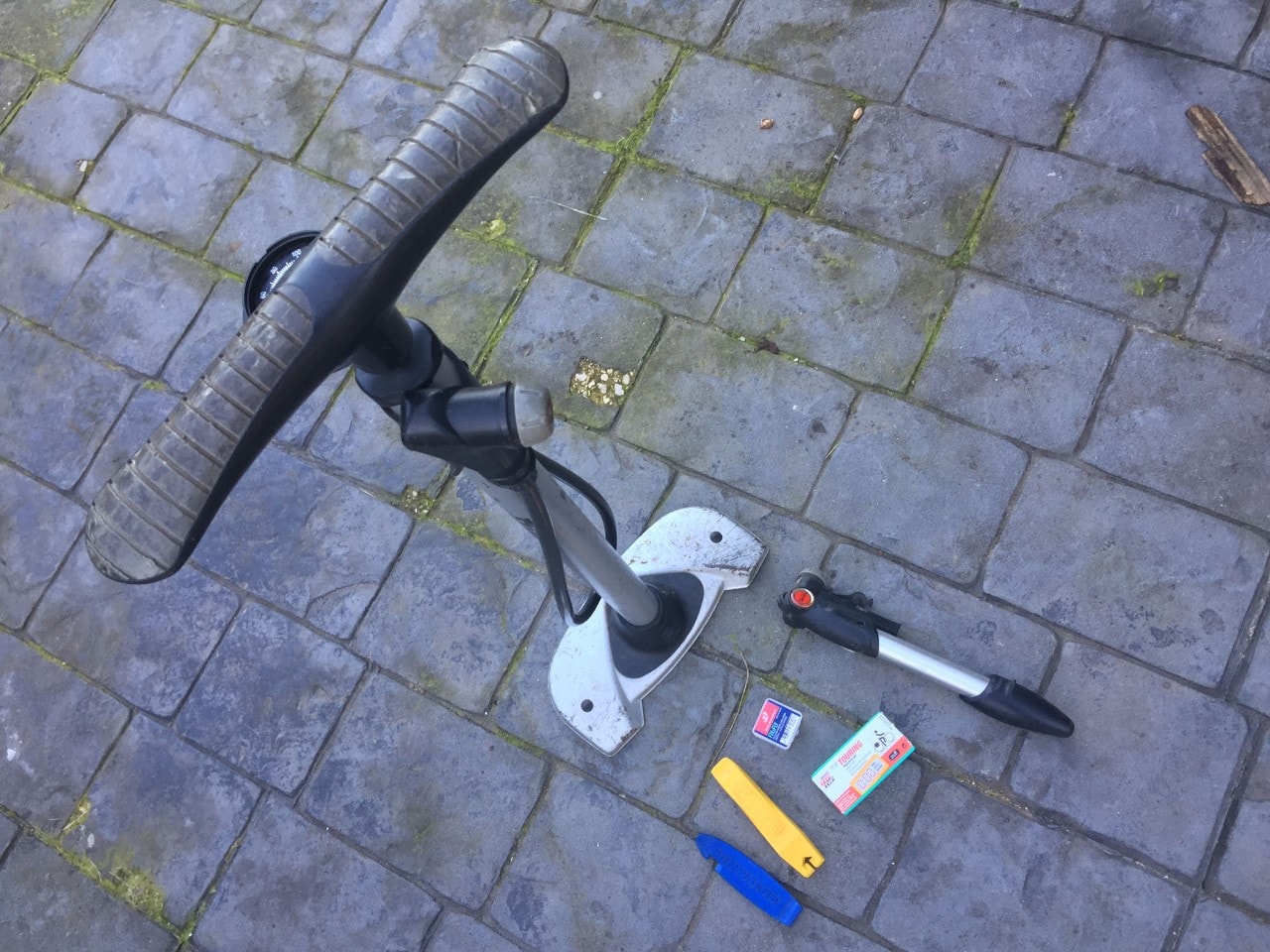 Qui vedete l'attrezzatura necessaria, tutto quello che serve sia se siamo per strada sia se operiamo a casa. In quest'ultimo caso, se l'abbiamo, possiamo usare una pompa da officina che renderà più comodo e veloce rigonfiare la ruota a fine lavoro, altrimenti, da portare con sé, una più comoda pompa poratile. Si vedono poi due tipi differenti di leve cacciagomme per stallonare il pneumatico dalla ruota e due tipi di kit con le toppe per riparare il foro.