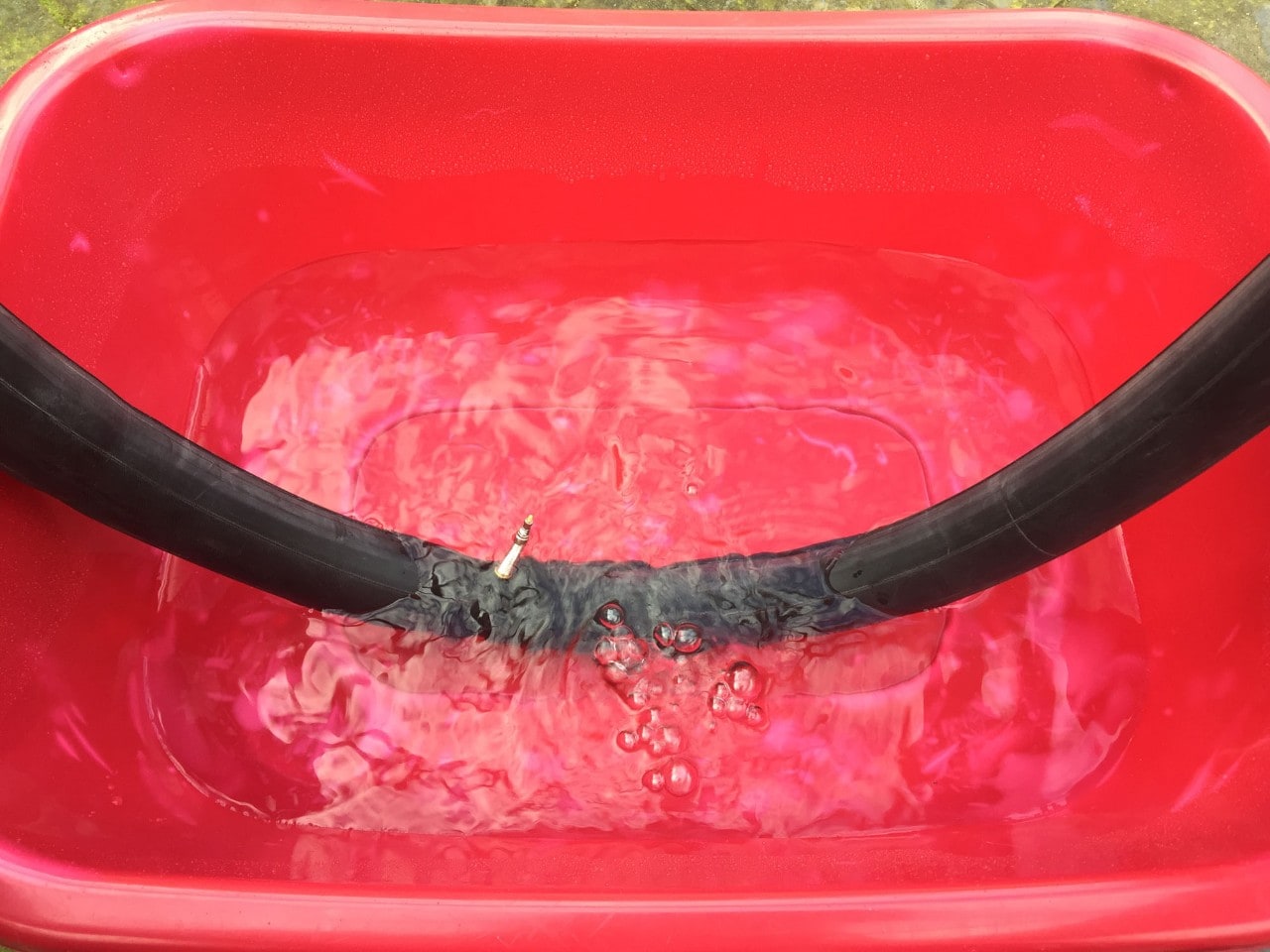In foto vi mostriamo il "vecchio trucco" della bacinella d'acqua per trovare rapidamente il foro, sistema chiaramente attuabile solo a casa e utile soprattutto per i fori molto piccoli. Se siamo in strada un buon sistema è, con la camera d'aria leggermente gonfiata in modo da metterla in pressione, farla passare davanti al viso vicino alla bocca perché le labbra sono una zona molto sensibile e colgono spesso più facilemente anche i più piccoli flussi d'aria. Come già detto possiamo anche decidere di mettere una camera d'aria nuova senza riparare al momento quella bucata per poi farlo a casa.