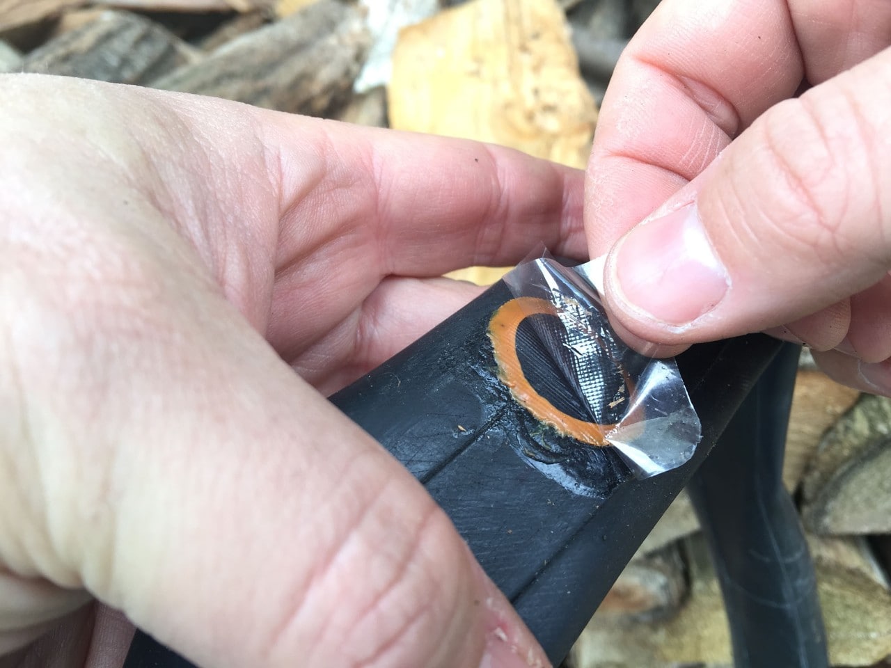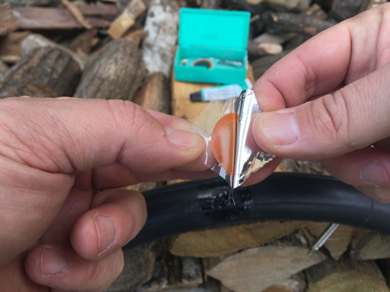 Passato qualche altro minuto, ne dovrebbero bastare al massimo cinque, si può togliere la pellicola, facendo attenzione a non far sollevare i bordi della toppa anche se a questo punto dovrebbero essere solidali con la camera d'aria.