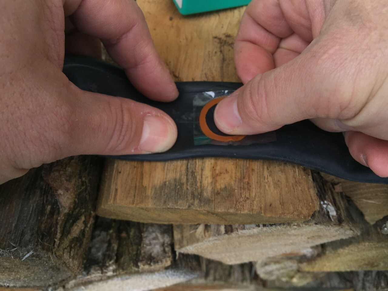 Per questa fase è meglio operare con la camera d'aria completamente sgonfia. Per far aderire bene la toppa si preme con decisione su tutta la superficie, premendo anche ai bordi dove è colorata di arancione, magari appoggiandosi su un piano.