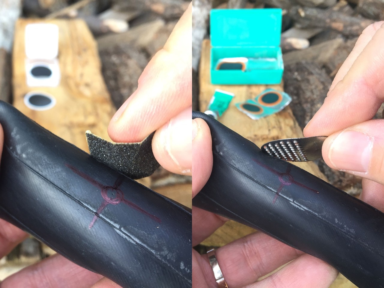 A seconda del kit di riparazione, con le toppe può essere fornito un rettangolino di carta vetrata o una sorta di piccola grattuggia. Servono a rendere più ruvida la superficie in gomma della camera d'aria, trattamento utile per facilitare l'adesione della toppa, sia che si tratti di quella adesiva (generalemente un po' meno resistente a lungo andare) sia che si tratti delle toppe da incollare con il mastice.