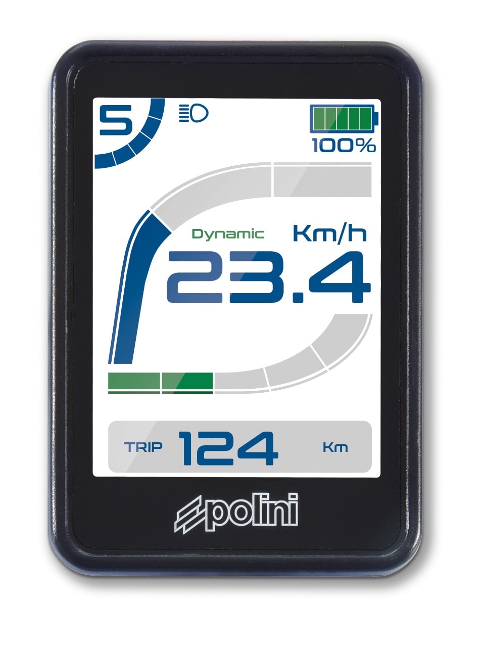 Il display TFT Polini è di facile lettura grazie a uno schermo a colori da 2,5 pollici adattive light, ovvero con adattamento automatico del colore e dell’intensità in base alla luce dell’ambiente. Inoltre mostra in maniera accurata la potenza di pedalata del ciclista, la cadenza, la potenza del motore e il residual range.