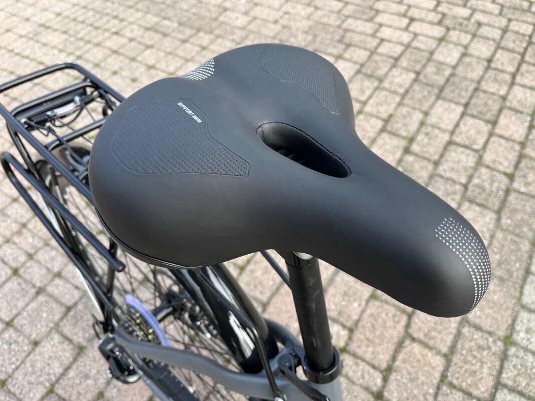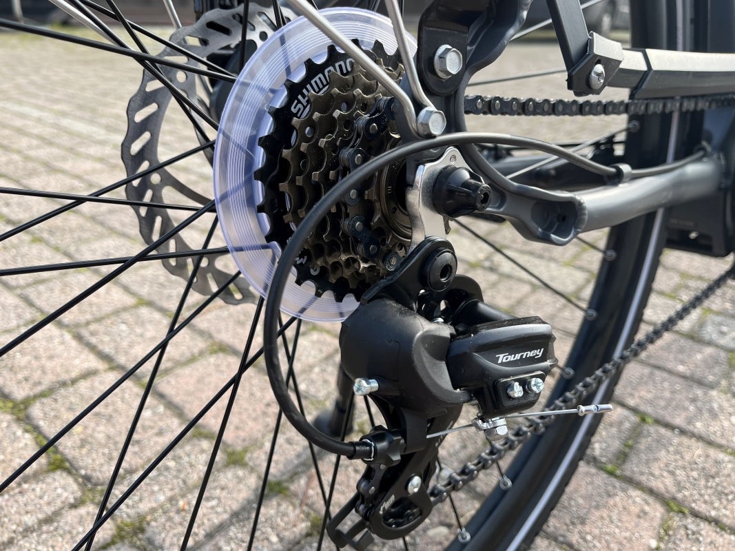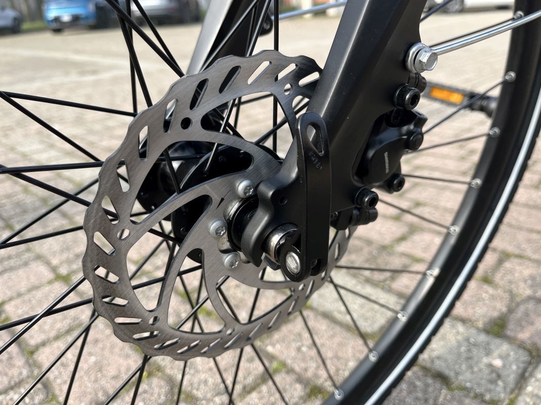 Più convenzionale invece la scelta del cambio, che è uno Shimano Tourney RD-TY300 a 7 velocità. Sempre Shimano sono i freni a disco, in questo caso idraulici. Pure in questo caso, il passaggio da meccanico a idraulico rappresenta un notevole passo avanti: ora la frenata è pronta ed efficace, molto modulabile e la richiesta di potenza sulle leve del freno è davvero minima.