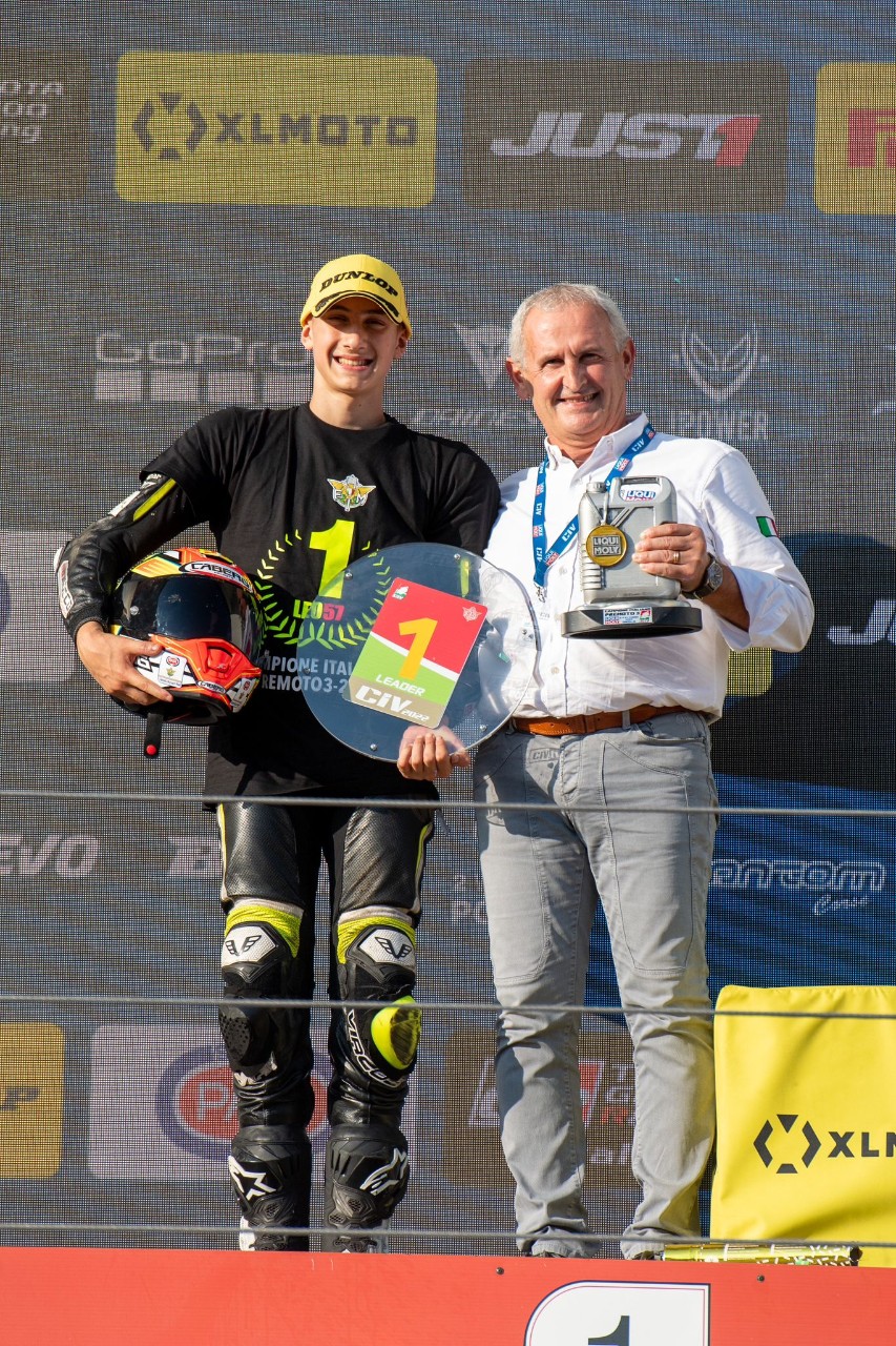 Emozioni a non finire in Moto3. Cesare Tiezzi e Nicola Carraro si sono giocati la vittoria in gara e il titolo fino all'ultimo centimetro di pista, con una grandissima bagarre che alla fine ha premiato l'alfiere AC Racing Team BeOn, vincitore e Campione italiano. Il pilota Pata Talento Azzurro FMI ha conquistato il titolo 2022 all'esordio nella categoria, in una stagione che lo ha visto collezionare due vittorie e cinque podi. Seconda posizione in pista e in Campionato per Carraro (We Race-SM POS Corse BeOn), che tornerà ora nel Mondiale Moto3 dove è impegnato in sostituzione dell'infortunato Matteo Bertelle. Terzo posto in gara, distante oltre sette secondi dalla vetta, per Biagio Miceli (Gresini Racing).