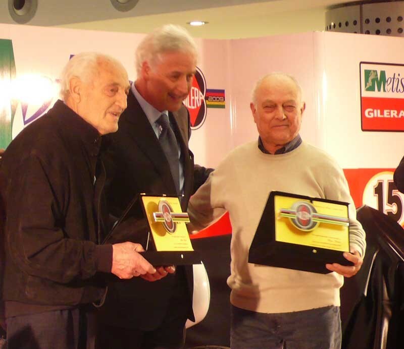 Un momento di intensa emozione quando l'anziano campione britannico (85 anni) è salito sul palco - dove era esposta la mitica Gilera 500 "4 cilindri", che dal 1950 al 1957 conquistò 11 titoli iridati - per ricevere gli onori da una vasta rappresentanza dei protagonisti del passato e del presente della Gilera. Un momento significativo che ha riassunto passato presente e futuro di un marchio che nonostante i venti di crisi non perde la rotta rimanendo un riferimento nel motomondiale e nella bistrattata classe 250.