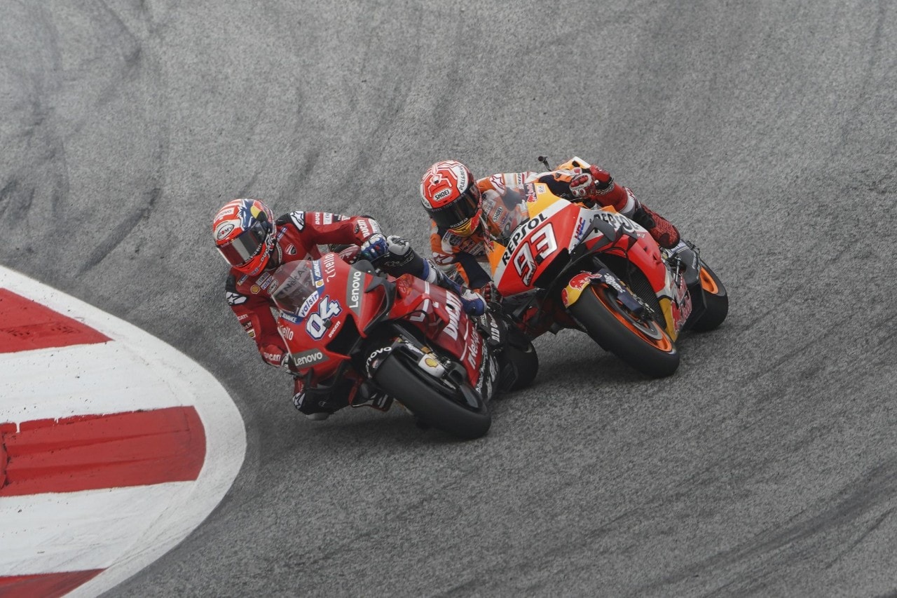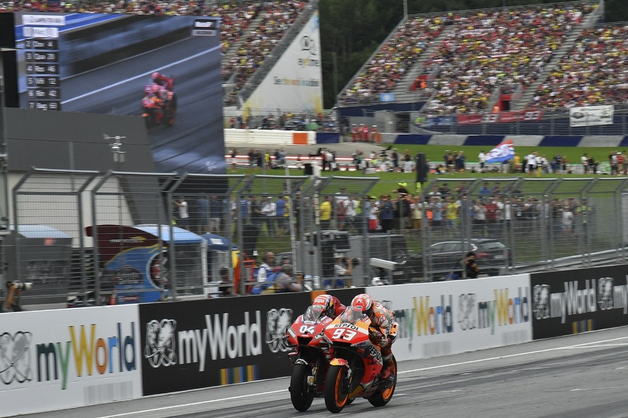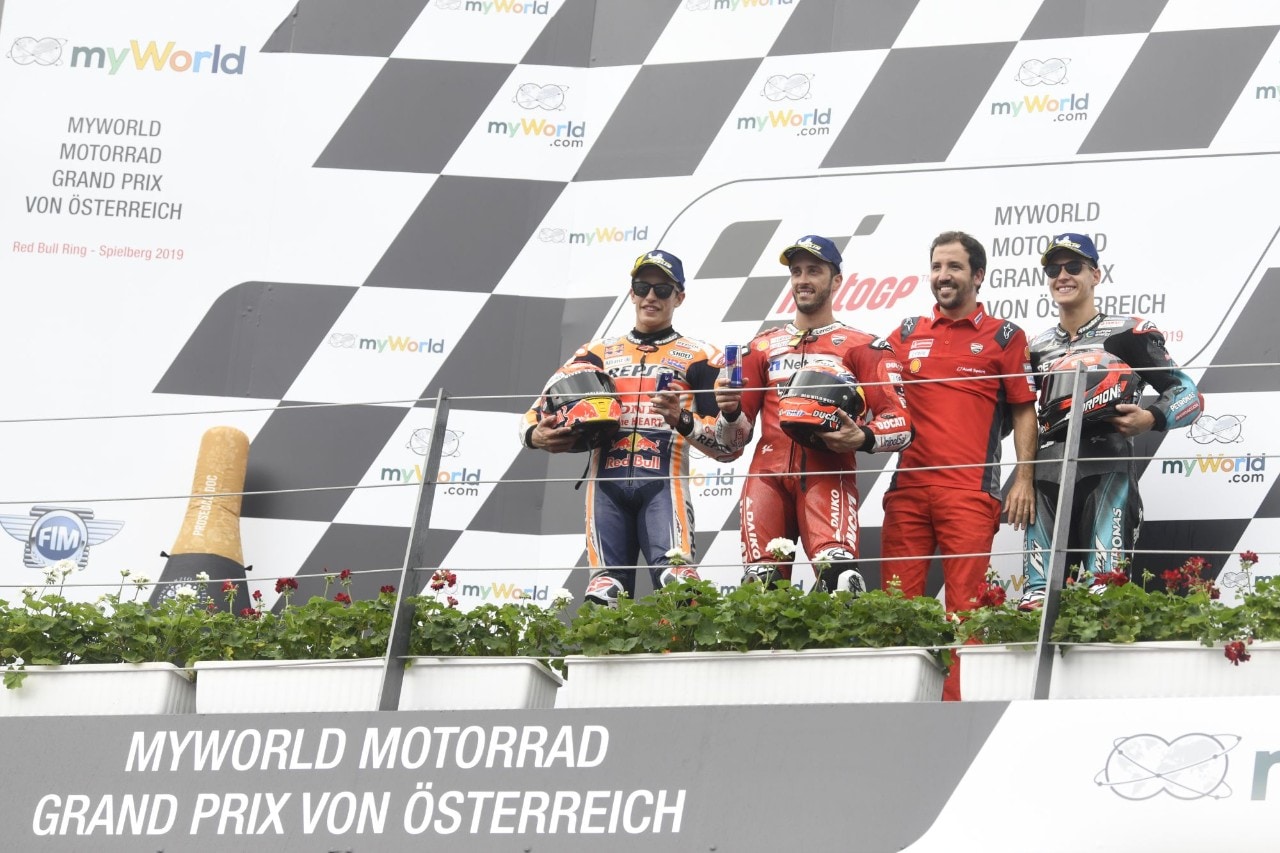 Prosegue la fila di successi Ducati in Austria, Dovi torna alla vittoria battendo Marc Marquez con un sorpasso decisivo. Il rookie Fabio Quartararo è ancora sul podio. Rossi scatta decimo e chiude quarto sorpassando Vinales nella classifica mondiale