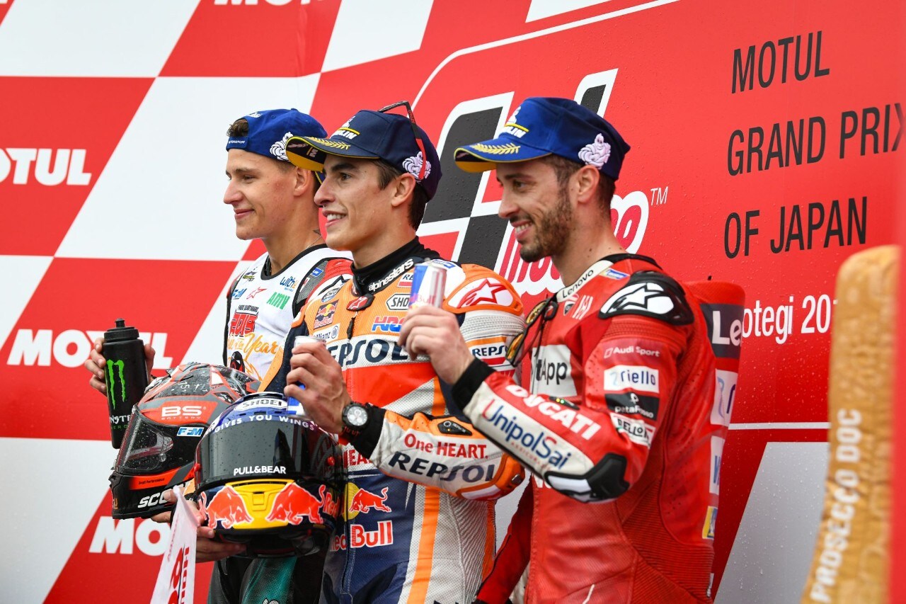 Il campione del Mondo a Motegi regala alla Honda vittoria e titolo costruttori. Quartararo è di nuovo sul podio con Dovizioso. A terra Rossi. Gioia italiana in Moto2 con il trionfo di Marini e in Moto3 con Dalla Porta che vince e allunga in classifica