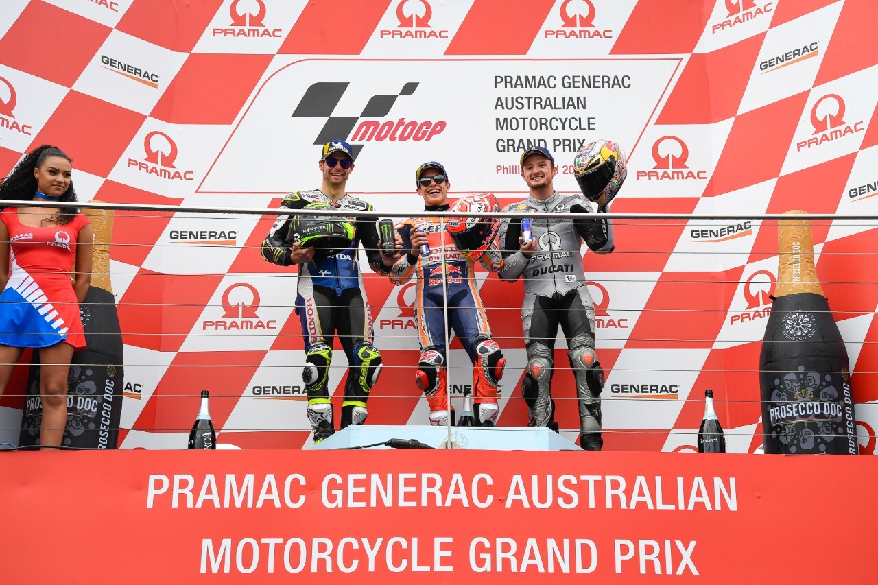 In Australia torna a sorridere Cal Crutchlow che sulla Honda del team LCR è secondo. Sorriso ed esaltazione anche per Jack Miler che sul tracciato di casa sale sul podio. La sua è la prima Ducati al traguardo. Ottima gara anche per il rookie Pecco Bagnaia, il campione della Moto2 dopo gare opache ha trovato il passo e il podio (il suo primo nella MotoGP) era a un soffio.