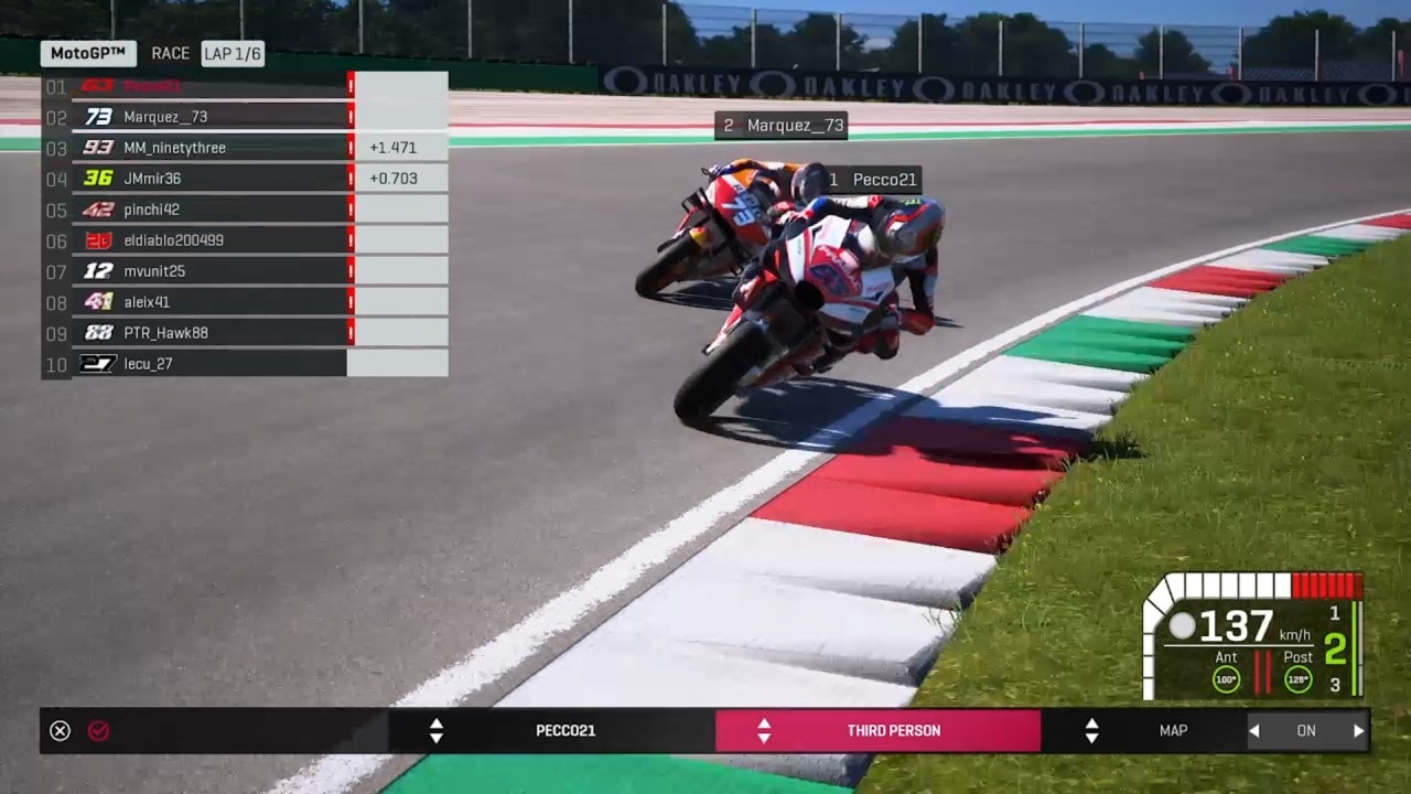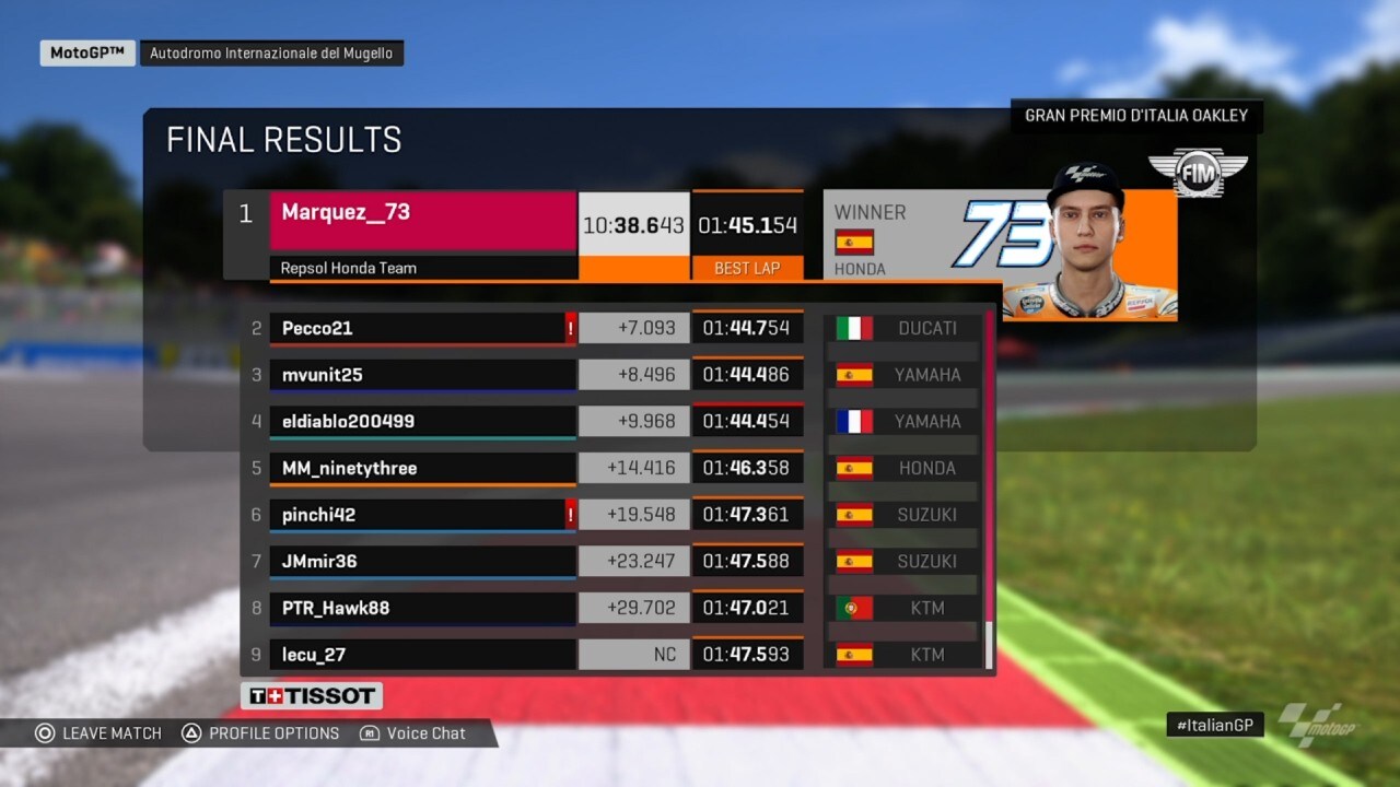 La formula di gioco semplice ha visto un breve turno di qualifiche e poi la gara. Gara (che potete rivedere nel canale Youtube della MotoGP) in cui Alex Marquez ha saputo creare un bel solco coi suoi avversari e dove Bagnaia ha mostrato di essere il suo avversario più temibile, con Maverick Vinales, alla fine terzo, che ha dovuto difenderesi anche virtualmente da un esplosivo Fabio Quartararo. Sempre nelle parti alte, ma mai incisivo come nella realtà Marc Marquez. Scoppiettante anche a videogiochi la coppia Suzuki con Rins e Mir.